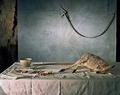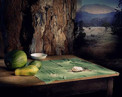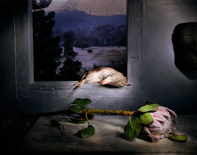 A still life is one way to describe Marian Drew’s narratives of deceased Australian animals created in the style of Renaissance paintings. “These creatures are not viewed from behind car windows or hanging from lines high above; they are there on the kitchen table, amongst the props that confirm to us that we are a breed apart from beasts. Their presence disturbs this comfort, implicating our involvement in the carnage, whether knowingly or not.”