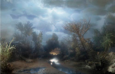 “Viewed from a distance, Kim Keever’s large photographs are of moody, damp environments – mist hovers over boggy ground, tropical plants crowd the embankment, streams snake across the dirt – and everything is oppressed by an uncommonly active sky with thick clouds that stretch for miles and then close off the view.