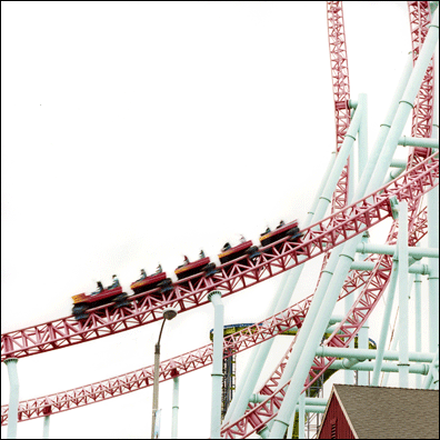 “Corina Gamma displays a foreigner’s wonder in her photographs of Los Angeles, delighting not in the “L.A.-ness” of her chosen subjects, but their “USA-ness”: amusement-park rides, their elaborate structures set against wide-open spaces; and housing developments, seen as repeated forms marching through space. In the former, Gamma looks up into the sky at the webs of struts and curves; in the latter, she keeps her horizon low, so that the march of rooftops is practically silhouetted against the sky. In recent video work, Gamma achieves the same near-Bauhaus elegance with a quasi-animated rhapsody on the roller coaster.”