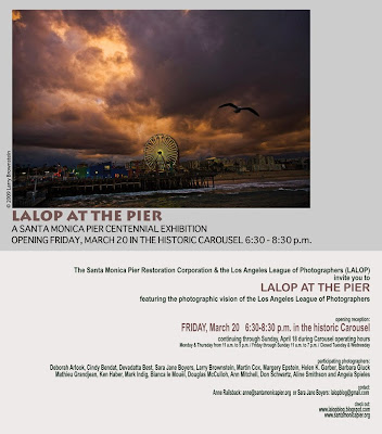 “In connection with the Santa Monica Pier Restoration Corporation’s year-long celebration of the Centennial of the Santa Monica Pier, the Los Angeles League of Photographers (LALOP) will share their photographic vision of the Pier with an exhibition opening Friday, March 20, 2009 from 6:30 p.m. to 8:30 p.m. in the historic Carousel. Also, on hand will be Santa Monica Pier Restoration Corporation’s community venue liaison and pier historian, James Harris, signing copies of his new book entitled Santa Monica: A Century on the Last Great Pleasure Pier”.