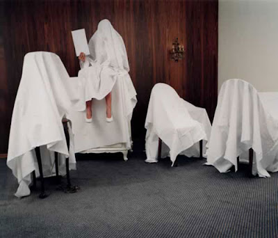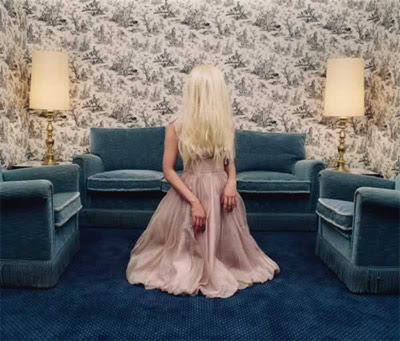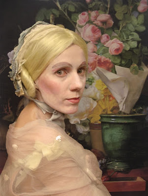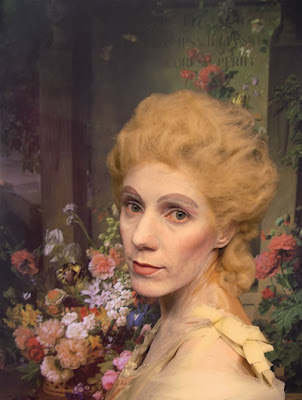 “Perched astride an eighteenth-century chest in a sumptuous room or limbs flailing inside a piece of industrial machinery, Michel both transforms her bizarre surroundings with her presence and, like a casually placed vase or forgotten handbag, becomes one with them. Always wearing gorgeous party clothes (the artist allegedly owns two thousand dresses and three hundred wigs), Michel is both a woman yearning to be the wild little girl with the run of the dress-up box and the good girl encouraged to be attractive yet not stand out too much from her environment.”