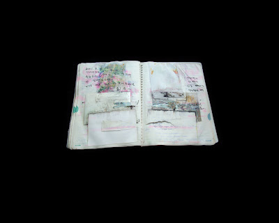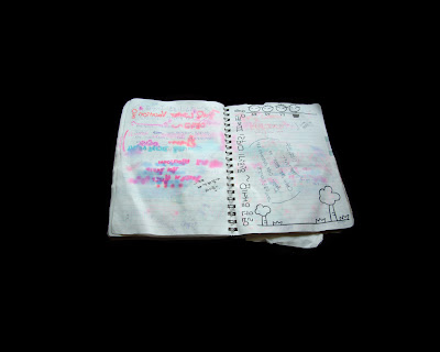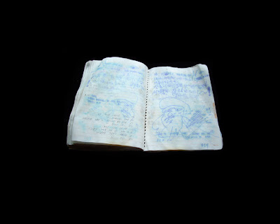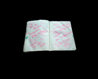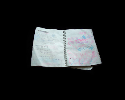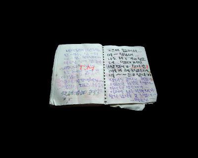 “The photographs of Korean notebooks began with the discovery of a number of student notebooks thrown away at the end of the semester. The notebooks were filled with neat Korean writing, some English words, drawings and sometimes scribbles. The notebooks got rained on and the inks bled through leaving a formally beautiful mixture of all of these elements bleeding together. I feel that these notebooks are a metaphor for my time in Korea. “