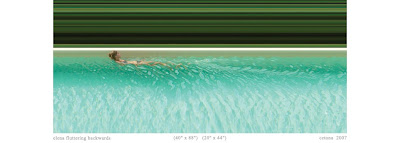 “The artist views the works in these series as spacetime photography. He equates his visual experimentation to stepping “through the looking glass” with Alice. In this parallel world of shifted perceptions, the ground rules are changed. Horizontal space is obliterated, shadows are crisscrossed, directional movement is confounded. Individuals appear isolated from the spaces they inhabit, and the relative speed of an object causes its expansion or contraction. Though the images are true photographs, they challenge the viewer’s effort to decode them.”