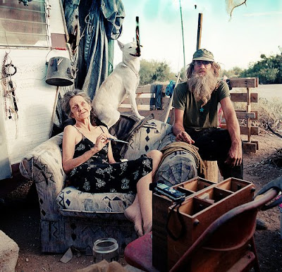 Slab City has been created by a small but committed squatters community. It lies in the Colorado Desert in southeastern California and takes it’s name from the concrete slabs that remain from an abandoned World War II base. It is a truly horrific and romantic landscape that commands residents to possess the same balance of beauty and beast. Unbearable temperature highs in the summer weed out the many who inhabit the free space in the winter, leaving only the most resilient, or the most unfortunate to become permanent residents.