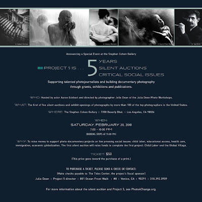 Project 5’s auctions will raise money for a five-year series of photo documentary projects on five pressing social issues: child labor, educational access, health care, immigration, economic globalization. The February 2010 auction raised funds to complete Dean’s current collaborative project, Child Labor and the Global Village.