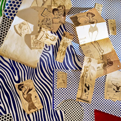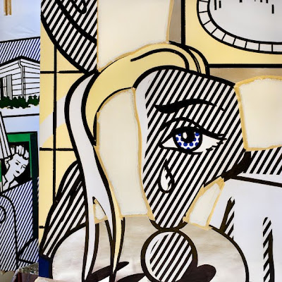 With my camera I observed what Roy saw… the newspaper ad of the “Beach Ball Girl,” for instance. I let his signature graphic components–the stripes, dots and bands of solid colors–suggest the compositions. The texture of Roy’s paintings in all states of completion, the presence of Roy, my awareness of his stature in our cultural history–all this inspired me.
