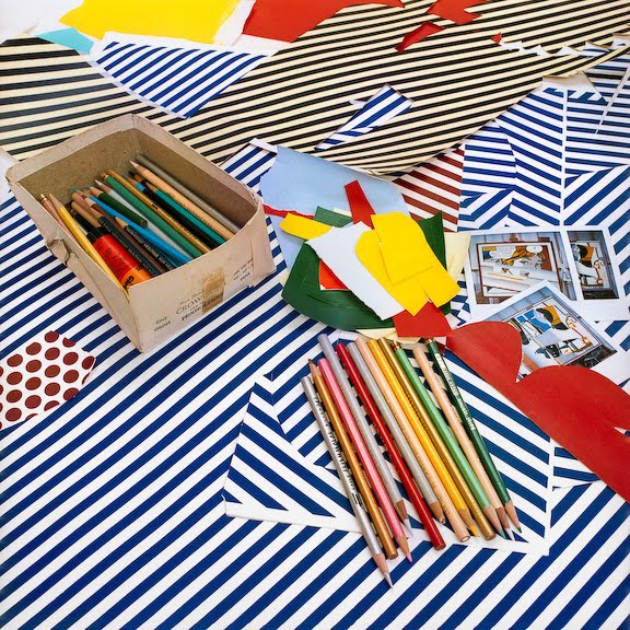 Walking into Roy Lichtenstein’s New York studio in the spring of 1990 I entered the artist’s visual world. Towering shelves of art books lining one side of the office led to a workspace where a tall “Brushstroke” chair stood. On the studio walls were large, nearly finished paintings, one boldly referencing Picasso. On expansive tables his resource and reference materials were readily accessible: elegant Italian sketchbooks juxtaposed with simple composition notebooks containing clippings from comic books and advertisements. Jars of paint, cans of assorted brushes, boxes of colored pencils, sheets of striped and dotted papers were all within sight. There were endless layers of things to visually captivate me, and to capture Roy the renowned Pop artist at work.