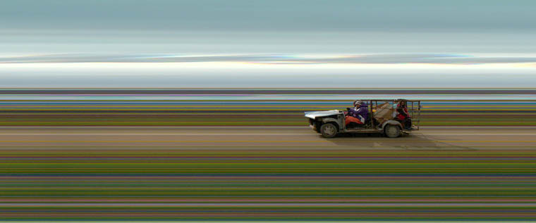 “The artist views the works in these series as spacetime photography. He equates his visual experimentation to stepping “through the looking glass” with Alice. In this parallel world of shifted perceptions, the ground rules are changed. Horizontal space is obliterated, shadows are crisscrossed, directional movement is confounded. Individuals appear isolated from the spaces they inhabit, and the relative speed of an object causes its expansion or contraction. Though the images are true photographs, they challenge the viewer’s effort to decode them.”
