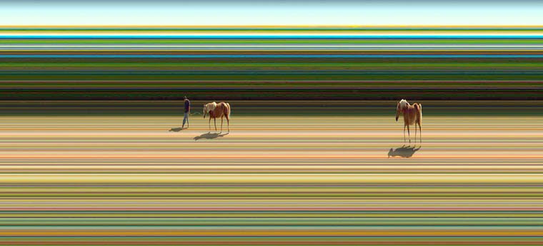Jay produces work that is on the forefront of new technology and photographic images that challenge the norms of perception. Employing a process that is distinct from conventional photography, he creates works that merge the recording of space and time into a single, linear “spacetime” continuum. The resulting photographs are akin to both seismographs and electrocardiograms in that, as timelines, they begin on the left and end on the right. The horizontal length of the image conveys an uninterrupted and fluid measurement of a brief span of time, varying in duration from 10 seconds up to 45 minutes.