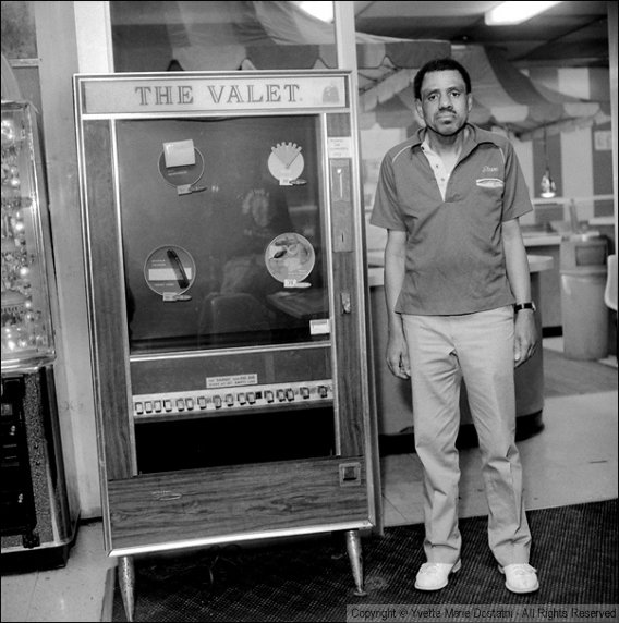 Steven Roberts, Thursday night league bowler. “I’ve been in a bowling alley most of my life. I’m a bowling bum, but it’s kept me out of trouble. My father owned a bowling alley on 66th and King Drive. I was in the bowling alley so much–I worked in the bowling alley, I lived in the bowling alley–I figured I might as well make money in the bowling alley. I started selling shirts in ’85–This and That sportswear. I sell bowling shirts. I sell family reunion shirts. I sell golf shirts. Anything you want. I got a nice price for you. I’ll fix you up. I started bowling in the ’50s. You couldn’t bowl in some alleys then. Now it’s Latinos, blacks and whites mixed together. It’s my second home. Some of my friends call it my first home.”