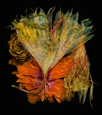 By cutting and opening plants and flowers with a razor blade, I find exciting small views that I have never imagined before and I record those on my scanner. Adding lamp oil to these mixes in a glass bottomed dish also is a wonderful way of slowly transforming flowers into wraith like creatures. I record the different stages which may take up to a week. I also have learned to manipulate with photoshop and use it sometimes to enhance or diminish aspects of this imagery.