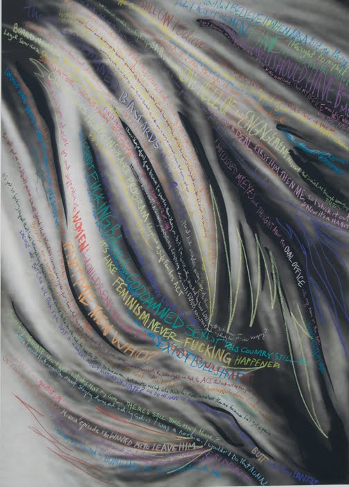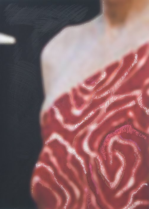Nancy shows a faceless, former first lady in an elegant red dress; the figure is cropped to an anonymous bust. Projected thoughts/texts are written/drawn on the surface of the garment. Details from Reagan’s life such as the attempted assassination of her husband to their personal relationship are literally inscribed on the subject’s body. Yury, playing out the role of the first lady, uses a confessional voice, exploring the tensions created by the incommensurability of the personal with living in the public eye, particularly as the feminine.