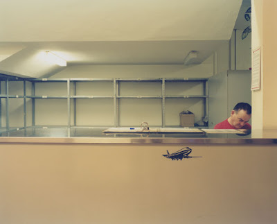 I knew there were discussions about the [Tempelhof] airport to be closed down in the near future. I did not want to miss the chance to have a look at this historical building while still in progress. When I stood in the huge main entrance hall of the building the atmosphere there immediately affected me. It felt more like being in a museum then in an airport – “silence” was the first impression going through my mind. You would not expect an airport in the 21st century in Berlin and in the middle of the city to have a calm attitude. I was totally affected by that. By chance I had my camera with me and started shooting. I only brought two rolls of film with me, but looking at the few negatives later on, I knew I had a project.