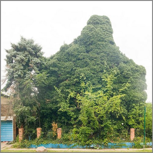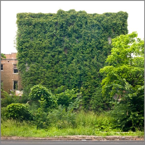 Feral means reversion to a wild state, as from domestication. It comes from the Latin root fera, for wild beast, but it also has a connection to another Latin word, feralis, literally belonging to the dead. Though it is usually used to describe animals, I have wondered if feral couldn’t also be used to describe certain houses here in Detroit. For a few beautiful months every summer, some of the tens of thousands of abandoned houses become feral in every sense: they disappear behind ivy or the untended shrubs and trees planted generations ago to decorate their yards.