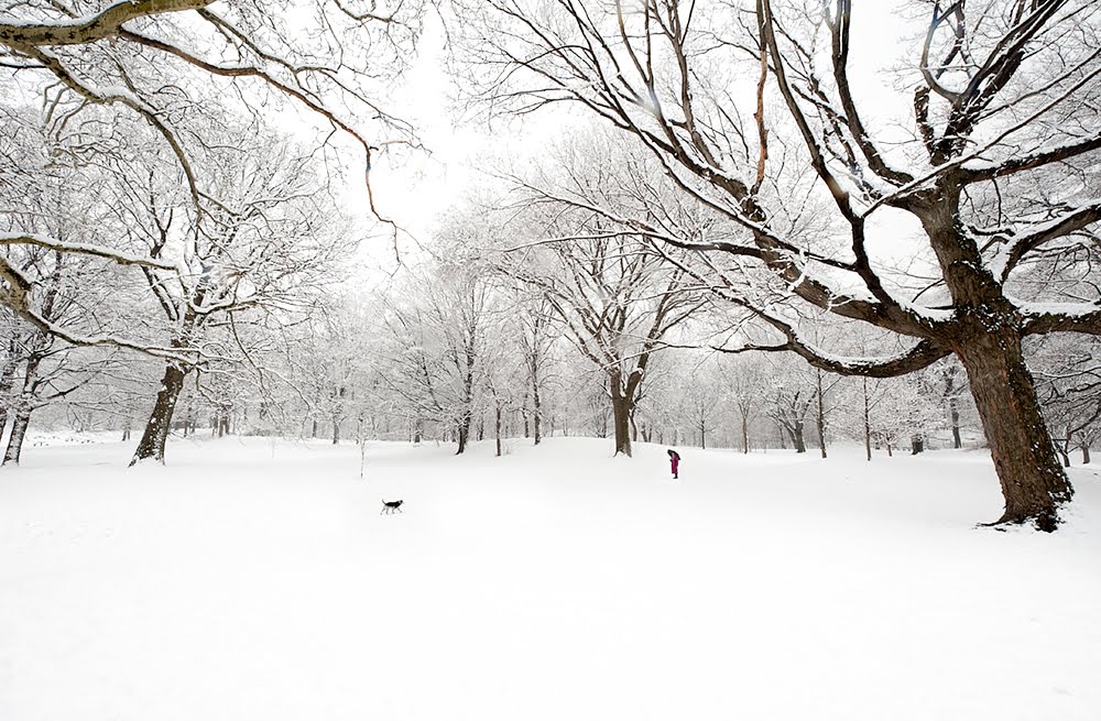 At first glance, many of the snowy spaces captured for this series might be mistaken for wilderness landscapes, stark white expanses rimmed by hills and bare trees. But on closer inspection, the lamps lining a path come into focus, faint hints of distant park benches appear, and backpackers are revealed to be urban dog walkers. Each winter, Brooklyn’s Prospect Park is transformed by the cold and snow and loses almost all cues to its origins as a human-designed landscape scraped out of one of the densest population centers in the world. It’s that incongruous mix of wilderness and incongruous urban detail that draws me in, that compels me to capture this juxtaposition of vast emptiness with hints of the immense human presence that exists just outside the frame.