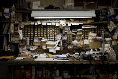 Because I document a space exactly as I find it, never arranged for the camera, the Workspace project is necessarily a spontaneous process. I can’t, for example, call ahead and explain what I’m after without inviting the destruction of what I hope to capture. Lately I’ve been finding workspaces by walking in off the street with camera and tripod and simply asking (though “simply asking” doesn’t quite convey the complex dance of explanation, skepticism, persuasion, and fascination that goes back and forth). What I end up capturing, then, turns out to be the work that was interrupted to answer the door.