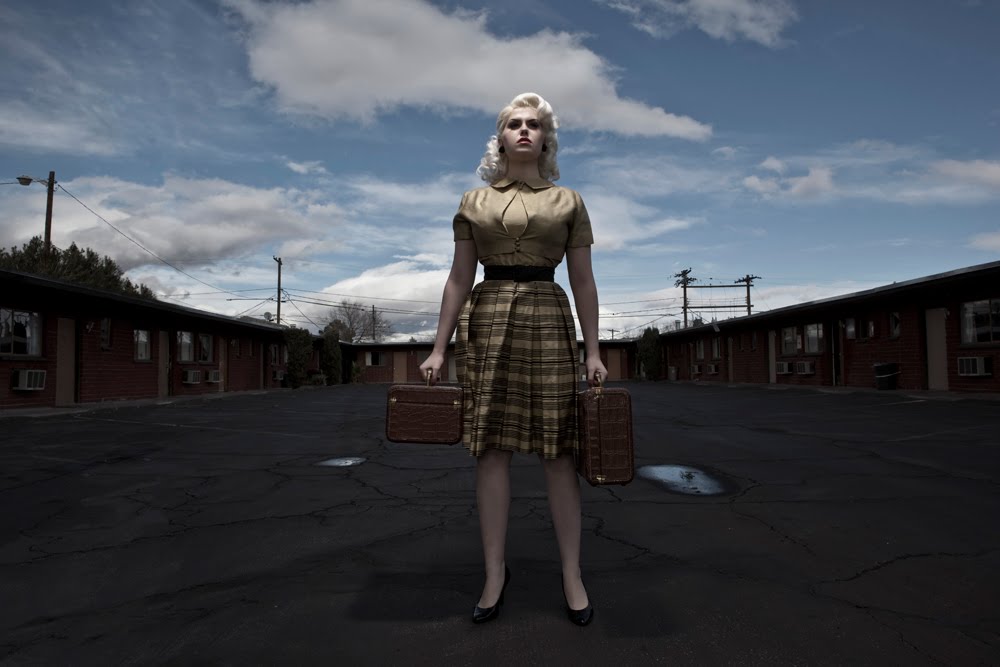The artists pay homage to the cinematography of Hitchcock, with influence from feminist photographer Cindy Sherman, as well as realist painter Edward Hopper. Sherman’s scandalous approach to photographic narrative is merged with Old Hollywood thriller romance. BJ focuses camera lens on the eyes of the heroine, while Richielle constructs reflections of persona in the landscape. Together they develop the missing story of the Hitchcock damsel in distress, retracing iconic trails through our “land of the free,” displaying mastery of light fit for the festering of darkest drama and doubt in both subject and you, most prized audience. Hopper’s theme of solitude and introspection on the modern American landscape seems magically transferred from canvas to photograph. “Circumstance” encompasses the tributes of Hitchcock, Sherman and Hopper at new altitudes, personifying American Beauty as vulnerable yet strong enough to give face to an alluring soul-searching calmness.