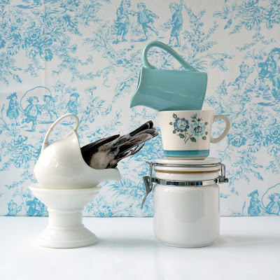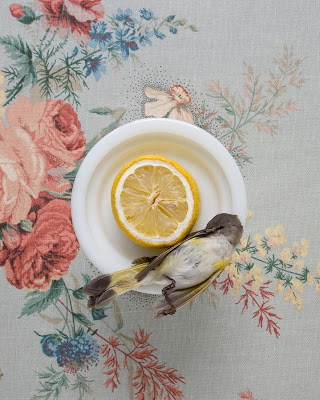 While her photographs are strongly influenced by her studies in Art History, she is also interested in exploring the natural world. Her series featured below, Domestic Arrangements, combine those interests in fanciful tableaus of color, pattern, texture, and wildlife. The result is a series of charming still lifes that allow Kimberly to create her own sense of the world.