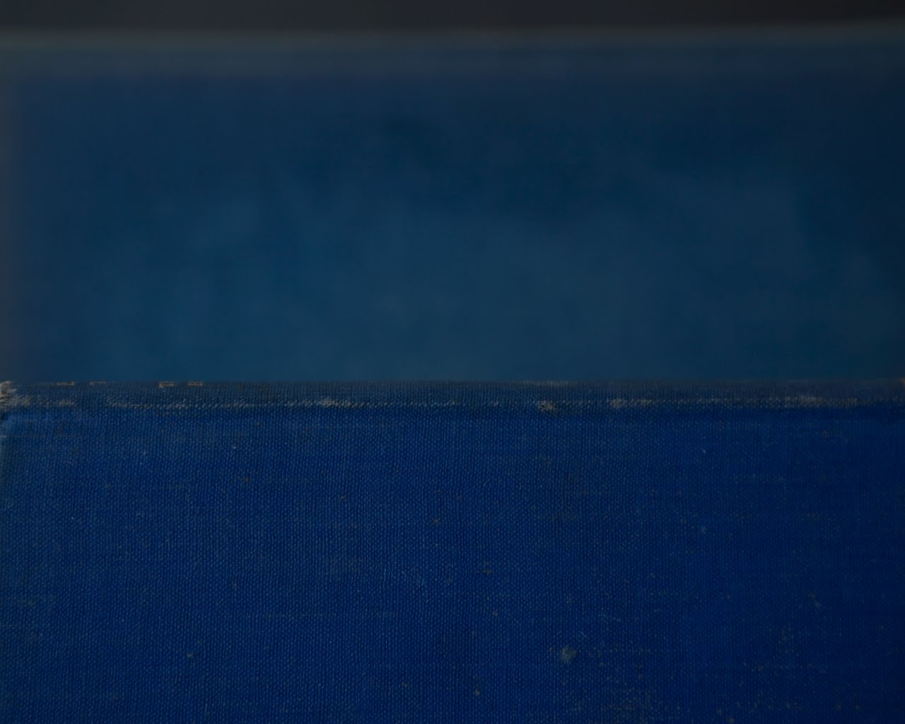 The colored planes of the books are seeped with damp blues some nearly black, like color field paintings that revel in the sensation of color. The texture of the book cloth reads like canvas stained with paint. I love the way color in a Reinhardt or Rothko painting seems to hover around the canvas. I play with camera focus to achieve a hovering effect and to evoke a sense of space up around your skin but fathomless like a lake at night.