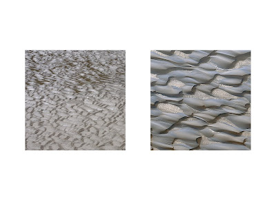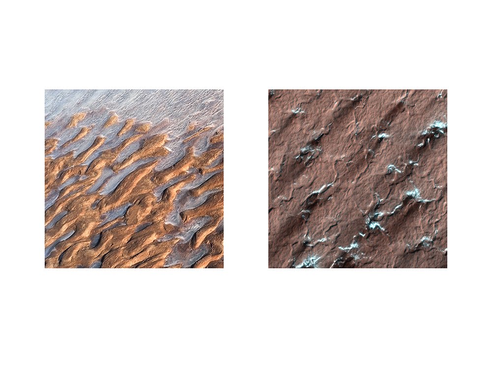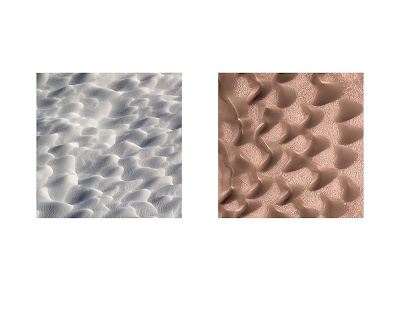 Hence these diptychs: combinations of landscapes and Mars-scapes that capture patterns that reveal both sculptural and chromatic rhythms, and, on another level, commonality of physical forces, often acting on vastly different spatial and temporal scales.