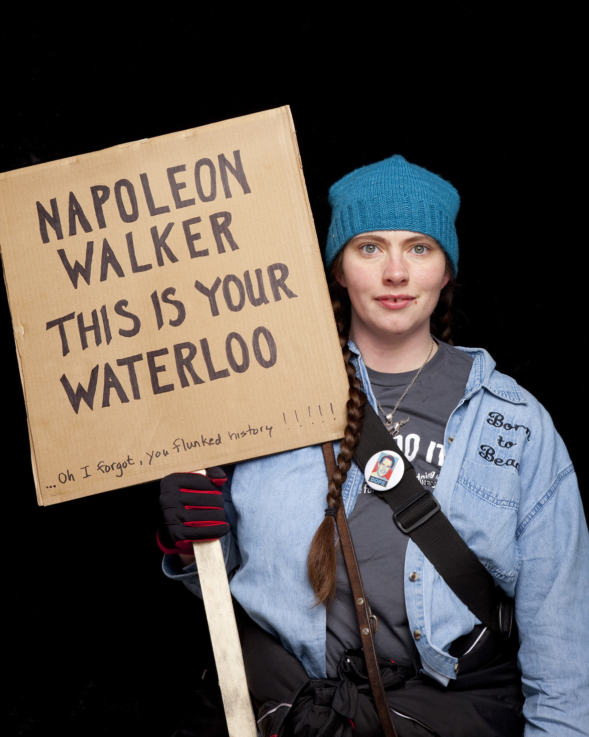 “These portraits were made on the sidewalk outside the Wisconsin state capital building in Madison. During the protests, the unofficial theme, expressed in words, drum beats and car horns, has been, “This is what Democracy looks like!” This is what Democracy looked like to me, in the form of faces, signs, buttons, and hard hats. “