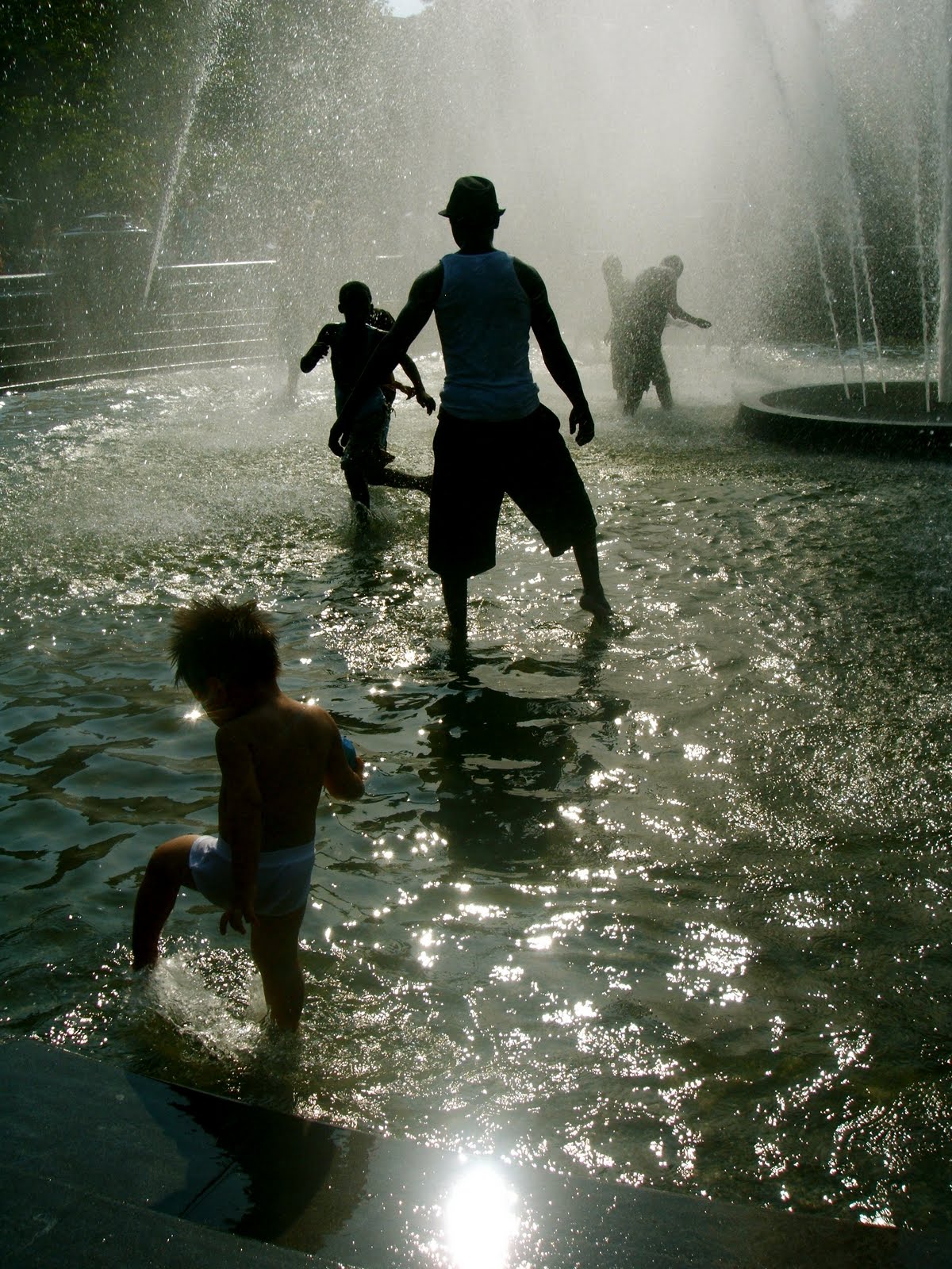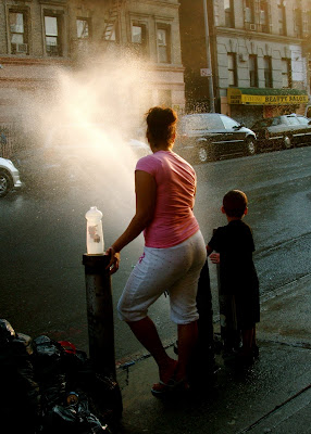 Now, in the 21st century world, Natal San-Miguel continues this tradition with the use of silhouettes and shadow to create magical worlds where water ripples with light underneath changing colors of blue to alternating shades of yellow and green due to the time of day. Many of these photographs exude an emotion of intense happiness and show a different side of the urban jungle, one that is pleasurable, where people relate positively with one another and where straightforward items such as a fire hydrant can be an endless source of community amusement. Natal San-Miguel’s work appeals to our inner child, one that finds beauty and joy in a city environment of hot summer sun and the shimmering water’s light.