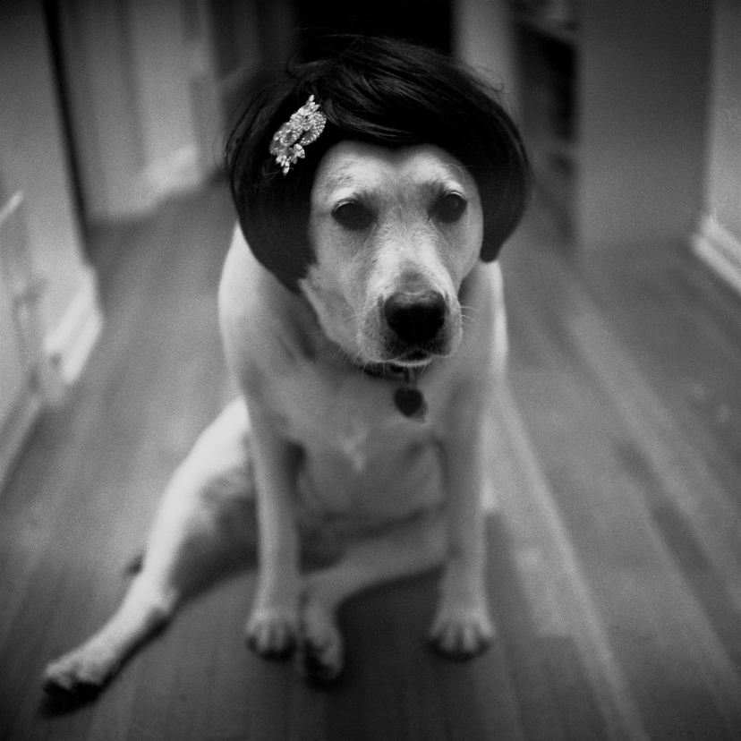 Riley was a big part of my photo life. From an early age, she discovered the camera. Whenever I set up my black velvet backdrop, she would simply plop herself in the middle of the fabric, ready to work. I often had to get her out of the frame as she wanted to be part of whatever I was doing. She had the patience of a saint, allowing me to cover her face in masks, wear wigs, be humiliated, and wait quietly for her reward.