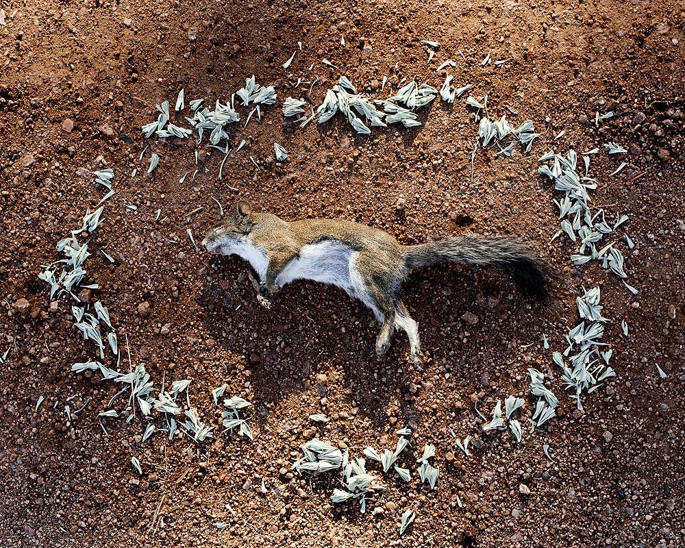 By surrounding the subject with living and fake flowers and stone markers, I elevate the often ignored and overlooked dead animal to the level of a human being and impart the beautiful grace of their fallen bodies. My photographs convey the sublime, the grotesque, and the lure of the macabre; we can hardly bear the visual of death, yet we cannot tear our eyes away.
