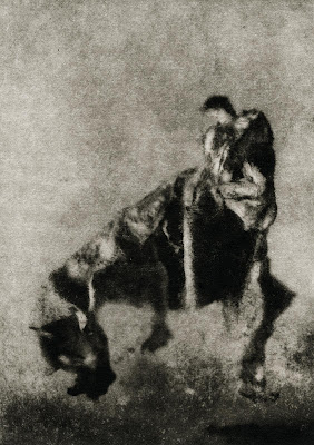 Photogravures were invented in 1870s. A copper plate is coated with a light sensitive gelatin. The coated copper plate is then put in contact with a positive photographic transparency and exposed to light. The plate is washed to remove unexposed gelatin leaving a hardened gelatin negative. The hardened gelatin negative that remains on the plate is then inked. The inked etched copper plate is printed in the same way as an etching in a copper plate printing press.