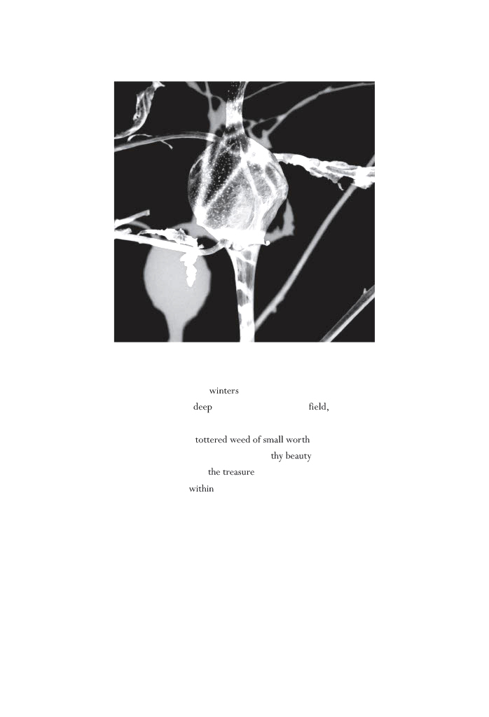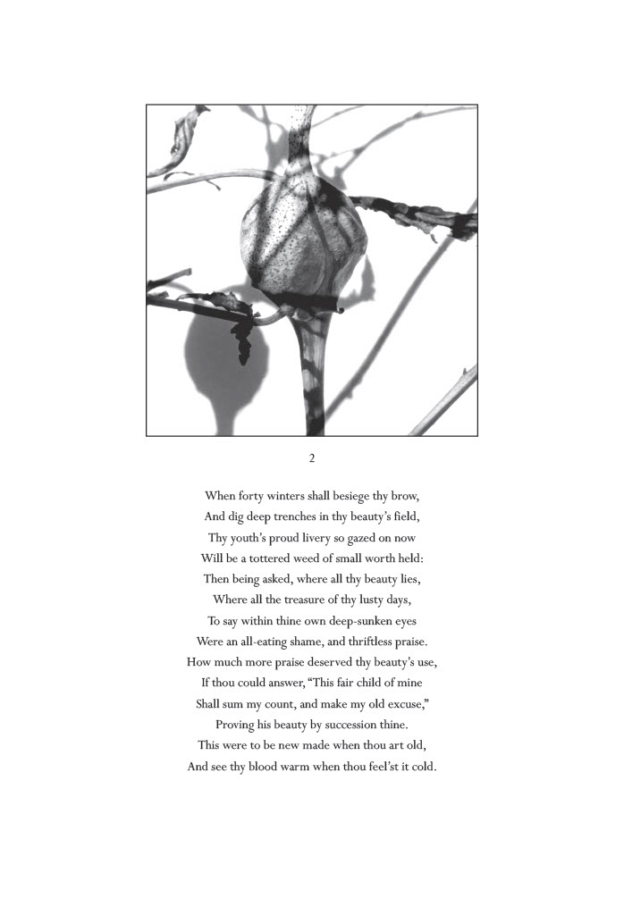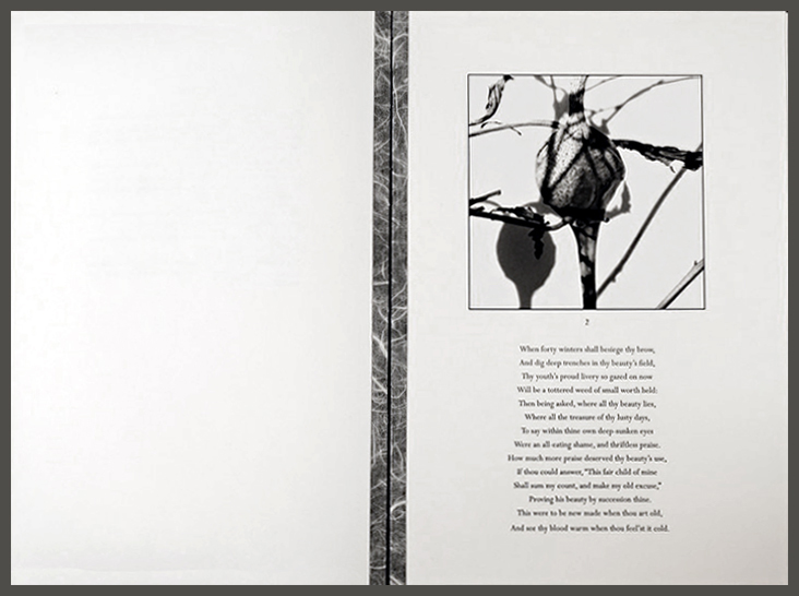 I was inspired to use Shakespeare’s sonnets after reading an essay about aging women and their appearance that quoted the well-known lines, thy glass shall show thee how thy beauties wear, thy dial how precious minutes waste. I turned to his sonnets on loss, aging, and death, which are less known than his love sonnets. As I read through them, I realized that Elizabethan English was difficult for many readers, and it felt too formal for me. I searched within the antique language of Shakespeare to find verse for contemporary poems, engaging in the long-practiced tradition of adapting Shakespeare for modern presentation while respecting the source. I called the resulting poems distillations, as they were formed by erasures of sonnets that offered clear and powerful lines that I kept in their place within the source, shaping the white space on the page. I paired the complete sonnet with a positive image and its distillation with the negative image. I printed the photographs on digital rag paper and letterpress printed the poems on the prints using photopolymer plates. Ghost Poems also received the Minnesota Book Award for Fine Press in 2006 and has become even more powerful for me as I approach my seventh decade.