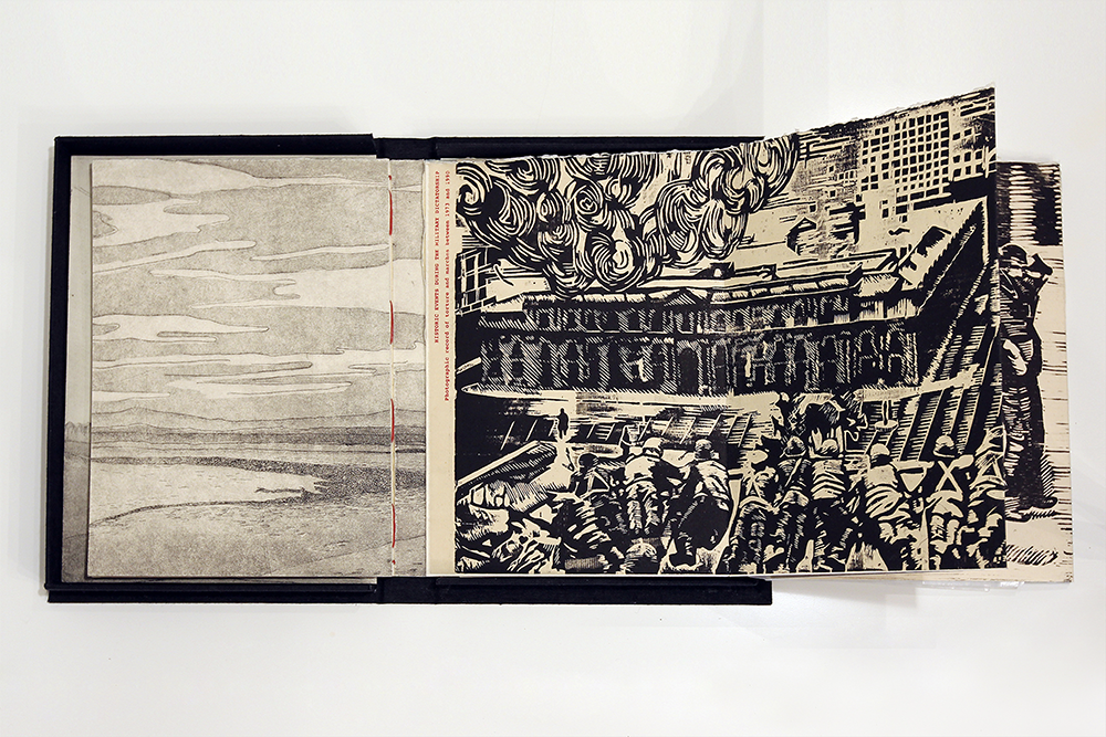 Memory & Landscape is an open book of Chile’s Truth and Reconciliation report, unfolding as a double accordion structure. One side features portraiture made with charcoal powder and silkscreen, while the other shows historical photos of repression in the 70s and 80s, presented through seven woodcuts.