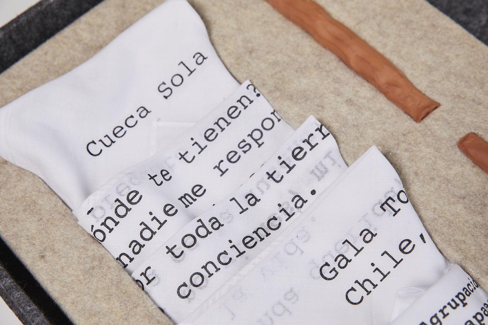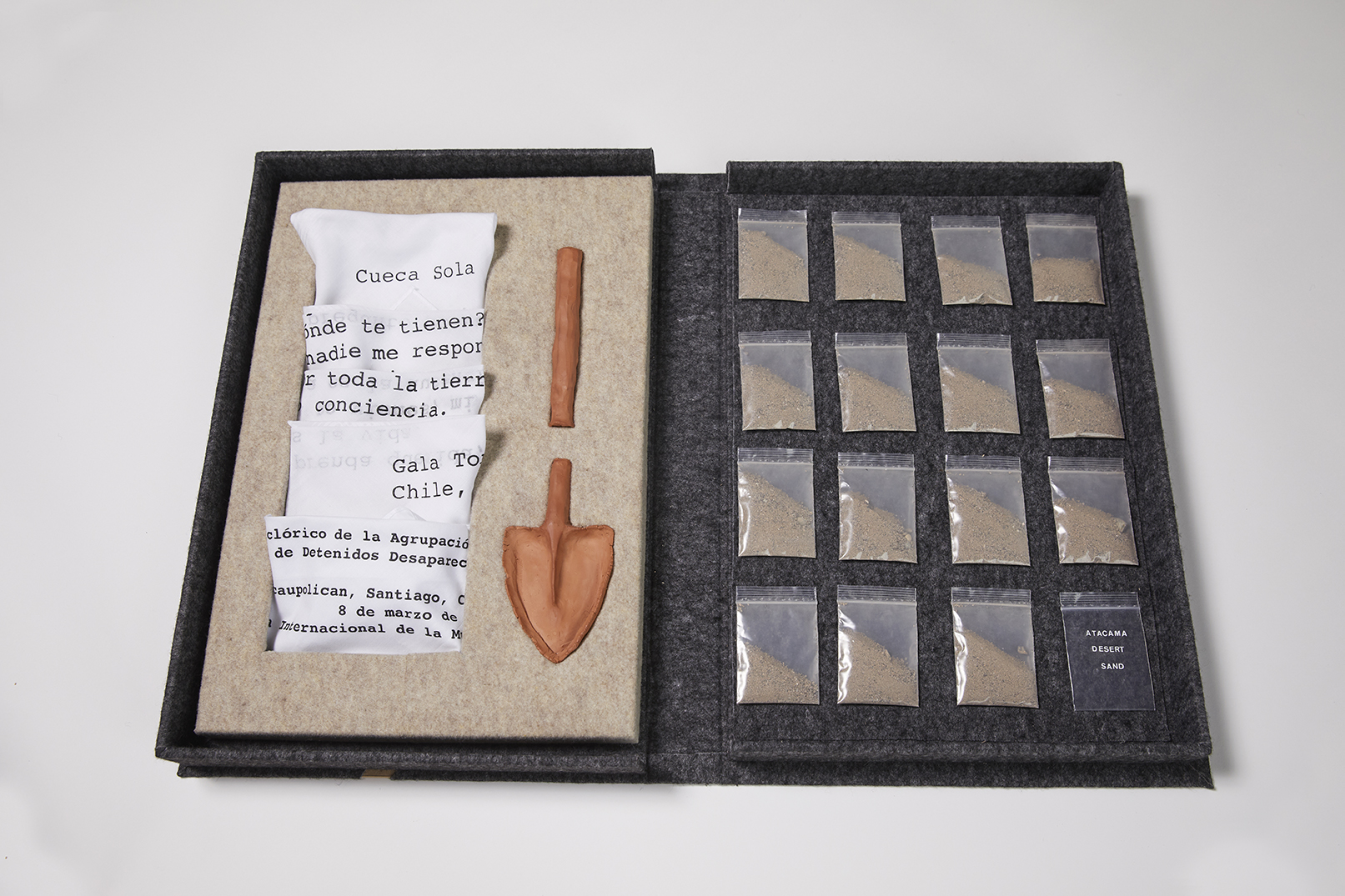 This commissioned artist book for the National Museum of Women in the Arts is inspired on the theme of geology of memory. The work brings together the enormous and vast bidimensional space of the Atacama Desert in Northern Chile and the chant of the mothers of the disappeared entitled Cueca Sola into a memorial book. The ongoing search of the mothers of the disappeared during the civic-military dictatorship still breathes underneath the earth as a live memory. The book is contained inside of a clamshell box with sandbags from the desert, handkerchiefs and a clay shovel.