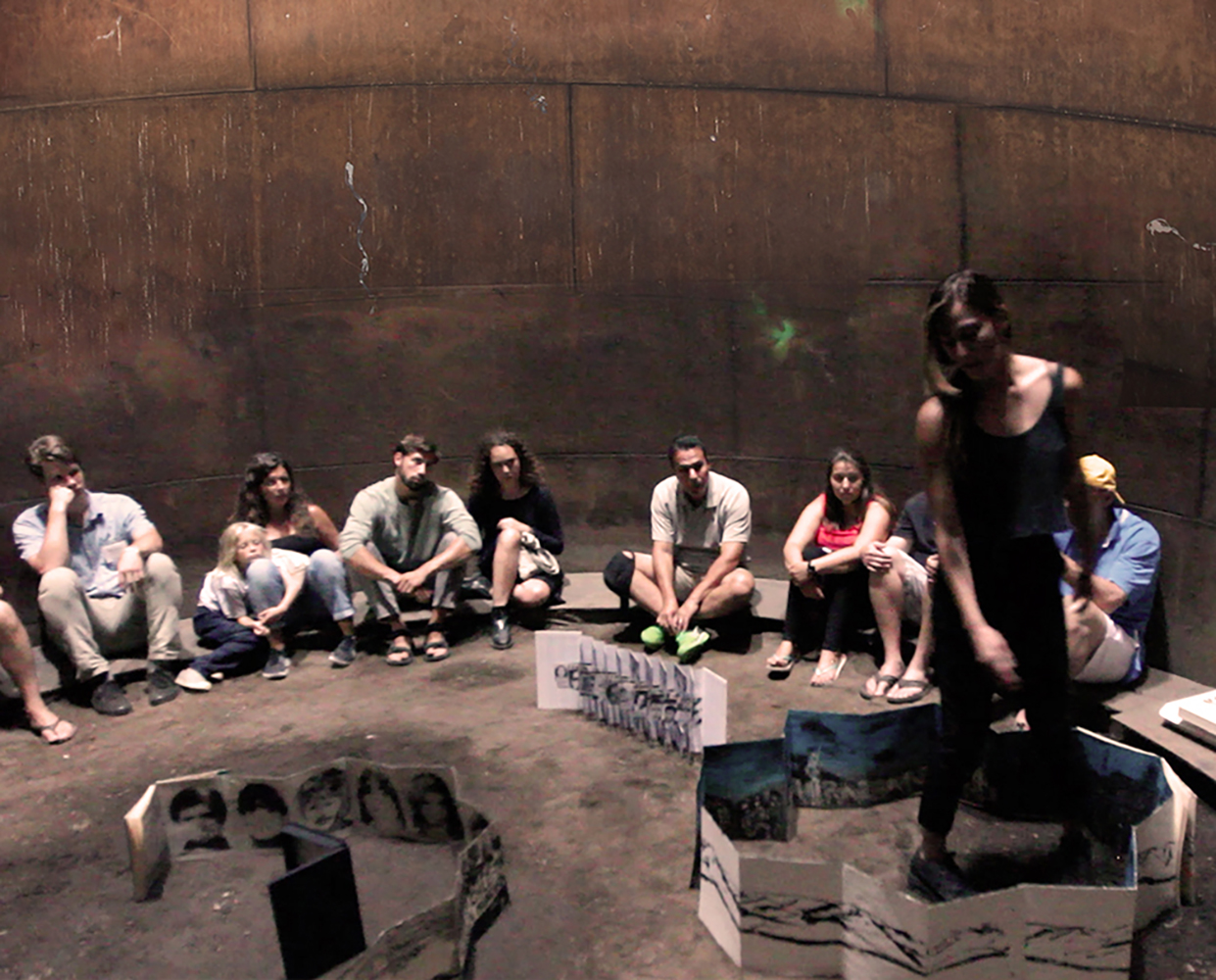 In Indignity & Resistance, the book becomes the Peace Park Memorial (formerly Villa Grimaldi), a torture center in the Andes foothills. It contrasts the horrors inside with the indifference of life outside. The book is shaped like a circle with walls: inside, images based on torture testimonies are painted with oil-based inks; outside, abstract lines of the Andes are transferred using water-based techniques. The oil and water contrast symbolizes the divide of the time, while the book is designed to be inhabited by the body, both physically and symbolically.