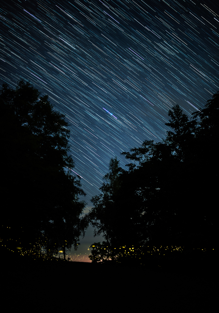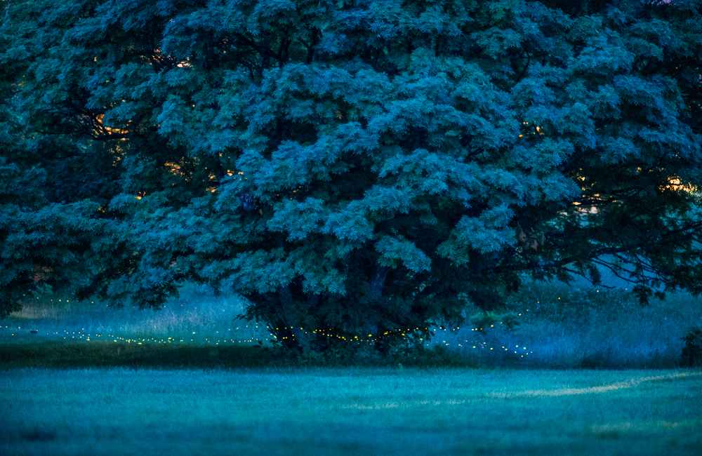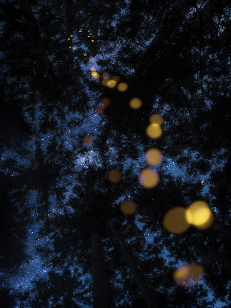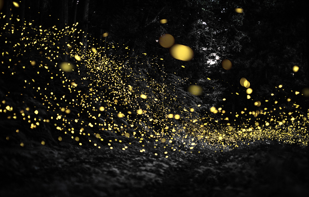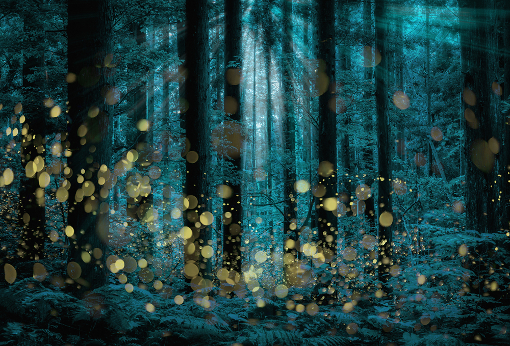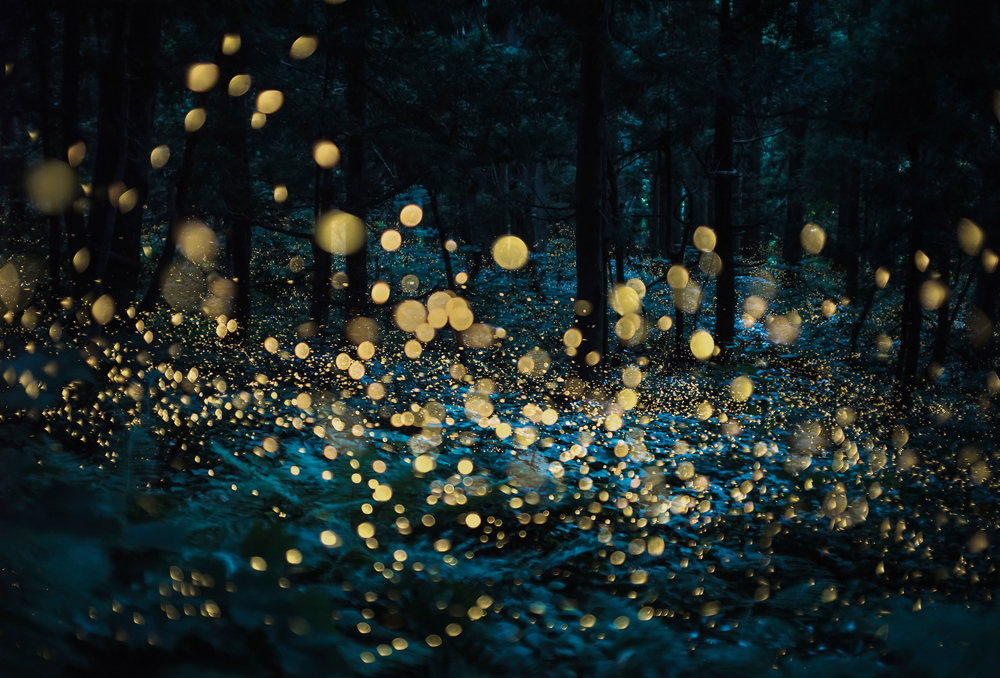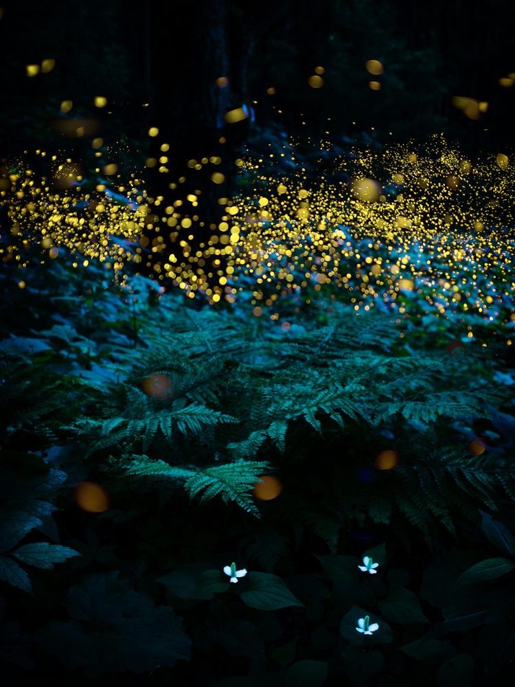 In this series, the trails of light drawn by fireflies are realistically captured and superimposed on the night forest. Alteration and damage caused by deforestation, natural disasters, climate change, and exploitation of wild places by tourism and industry. The mesmerizing light and awe-inspiring images of the forest at night suggest the need to protect the forest. The unpredictability of the fireflies’ trails of light suggests concern about the urgency of our planet’s climate crisis, while at the same time holding a strong and enduring hope for the future.