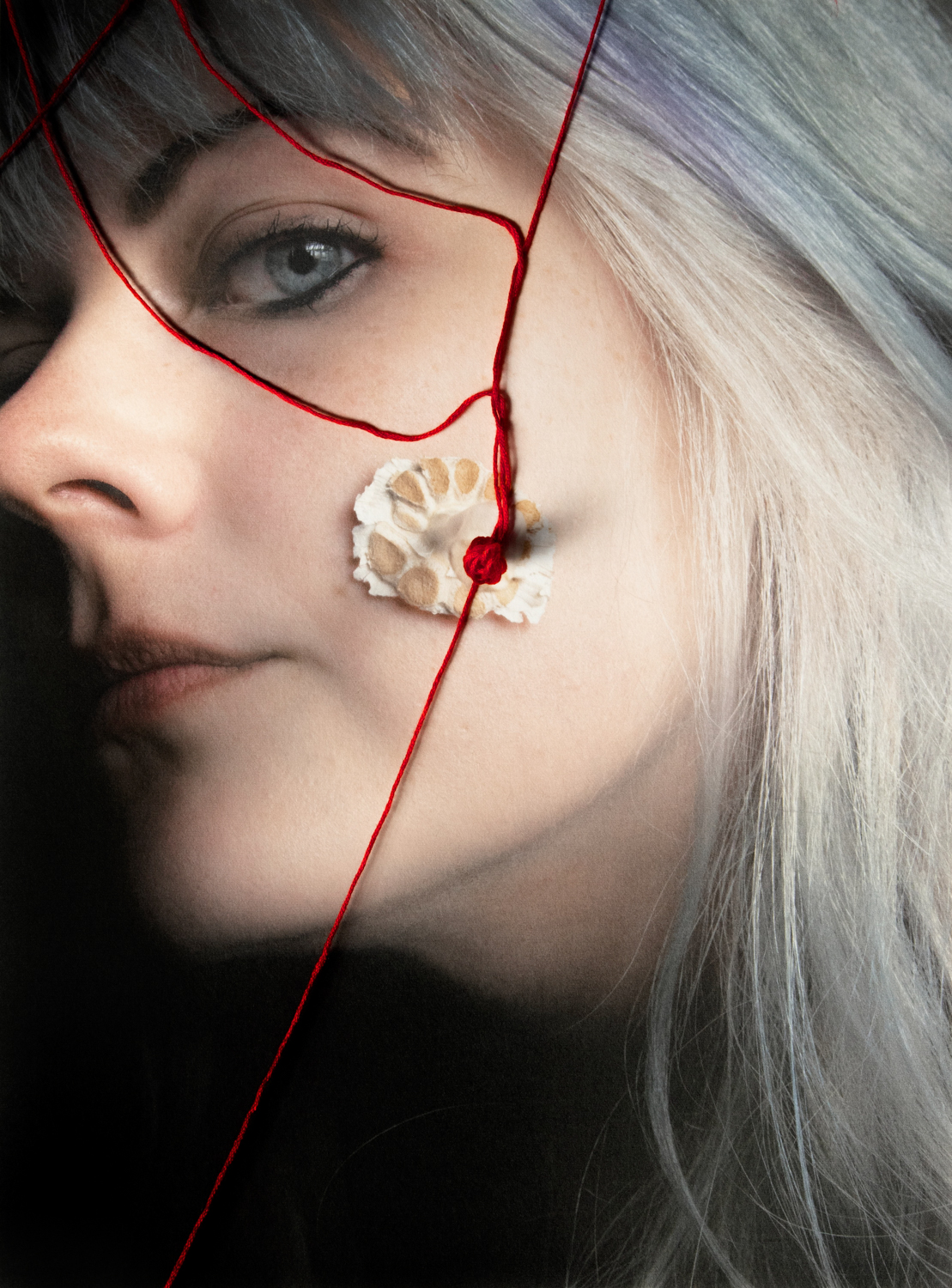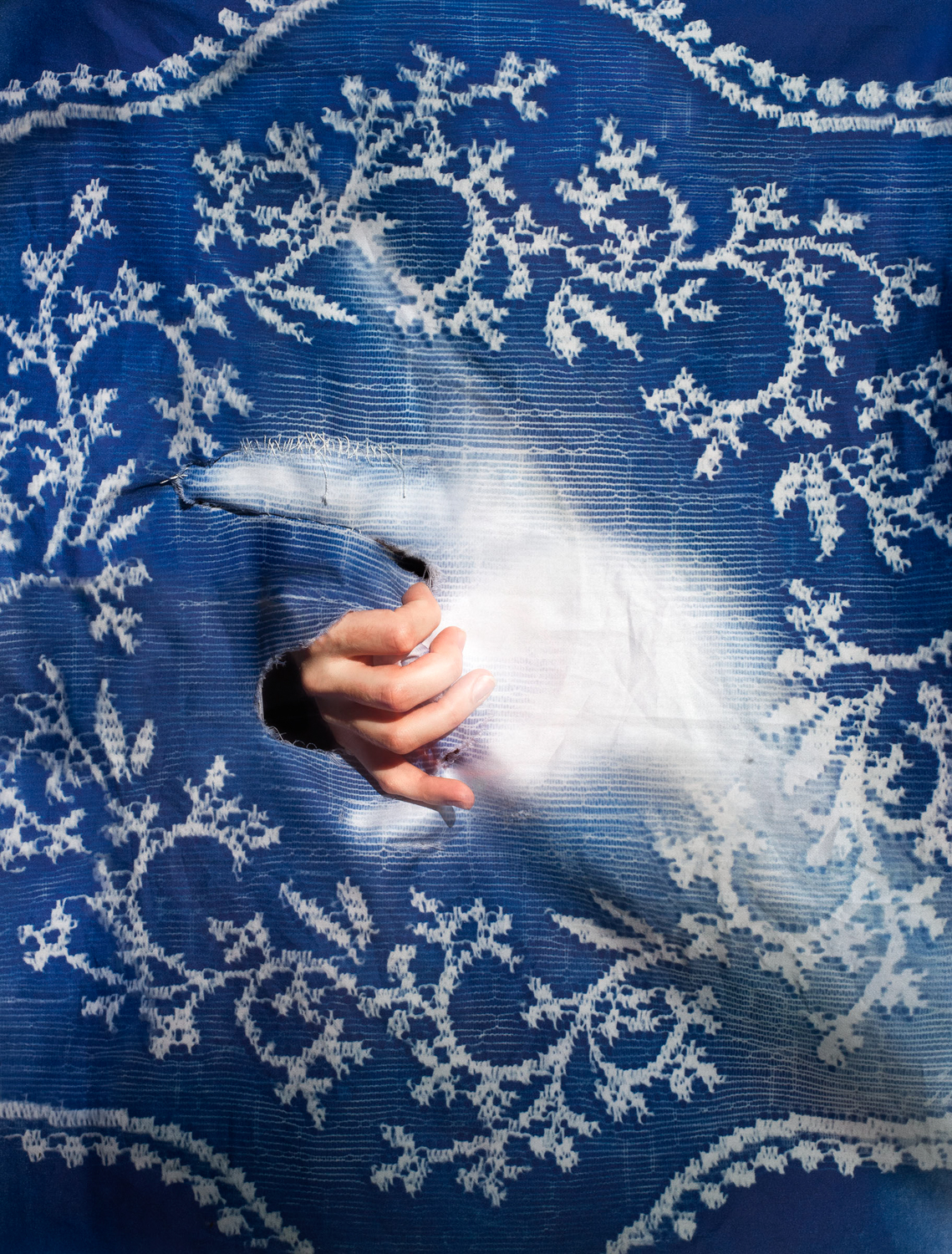 The glitch as a visual strategy marks the points, or ruptures, at which two distinct threads of time or space begin to touch and blend together or break down. While the more recognizable form of the glitch usually marks some kind of error in a software program, I’ve translated that to my /bodycrumbs work as errors in physical spacetime (the ‘physical interventions’ you see) – holes in a piece of cloth, a ripped edge across my torso, a thread that seems to weave both inside and beyond the frame of a photograph, or small punctures around the edge of my eye. The glitch as puncture, wound, hole, rip, rupture… this is a bit of a callback to Roland Barthes’ idea of the punctum – that subjective thing that shoots out of the picture like an arrow and pierces the viewer.
