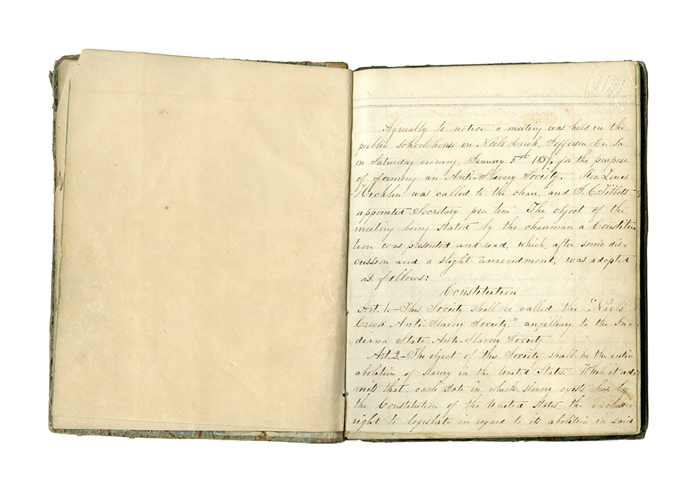 © Jeanine Michna-Bales, Page from the Neel’s Creek Anti-Slavery Society, which formed in Jefferson County, Indiana, on January 5, 1839, with the object of “the entire abolition of slavery in the United States.” Among the Society’s members were local Underground Railroad conductors Samuel H. Tibbets and Reverend Thomas Hicklin. Rare Books and Manuscripts Department, Indiana State Library. From the photographic essay “Through Darkness to Light: Photographs Along the Underground Railroad,” 2002 – 2016