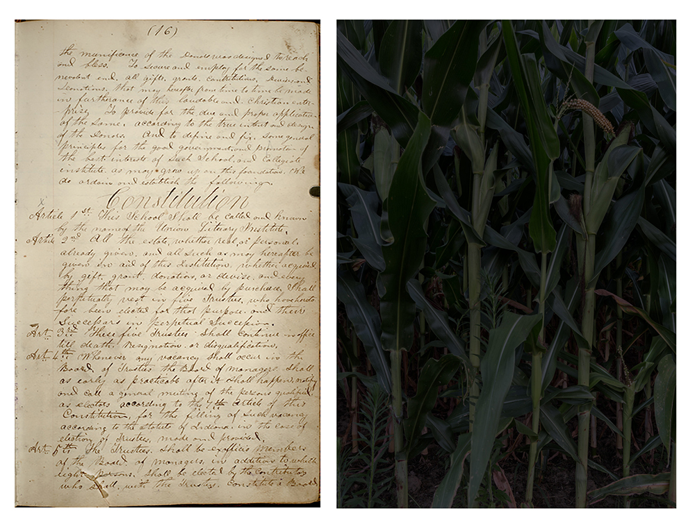 © Jeanine Michna-Bales, Left Side: Union Literary Institute Constitution from the Board of Managers’ Secretary Book. BV1972_016-018, Indiana Historical Society. Right Side: Approaching the Seminary, Near Spartanburg, Indiana, 2014 an image from the photographic essay “Through Darkness to Light: Photographs Along the Underground Railroad,” 2002 – 2016