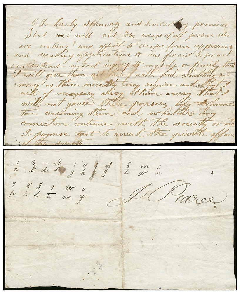 © Jeanine Michna-Bales, Front and Back of Signed Underground Railroad Pledge that has a code and the signature of J. Pearce. Indiana Historical Society, M1099 from the photographic essay “Through Darkness to Light: Photographs Along the Underground Railroad,” 2002 – 2016