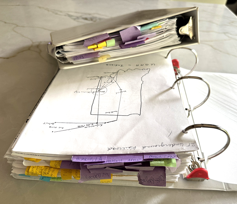 © Jeanine Michna-Bales, binders holding newspaper clippings and other research materials organized by location for the project “Through Darkness to Light: Photographs Along the Underground Railroad,” 2002 – 2016