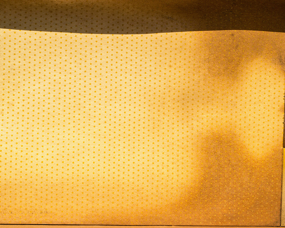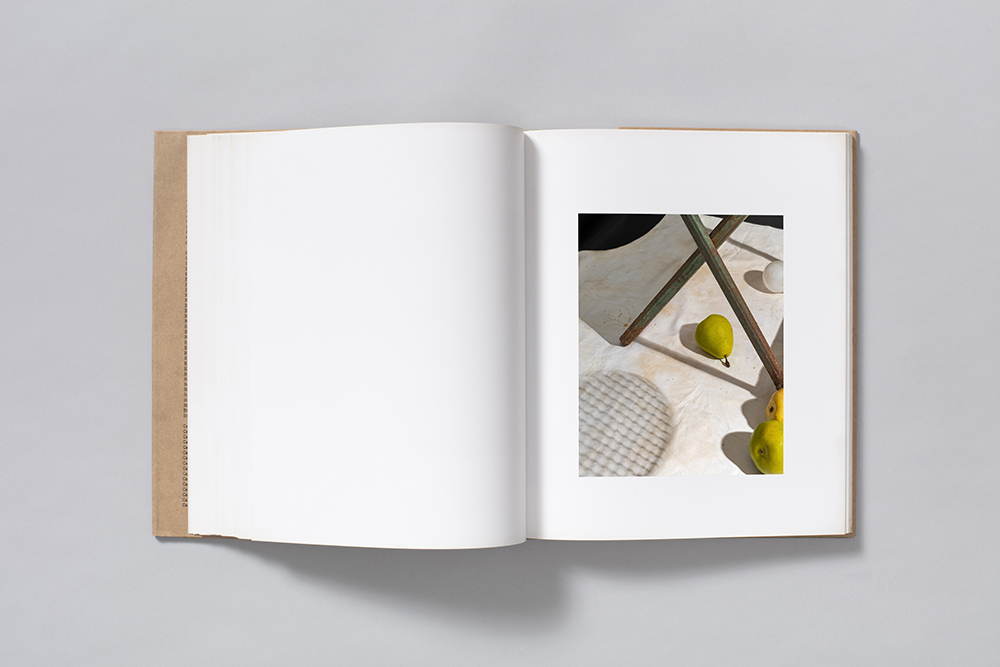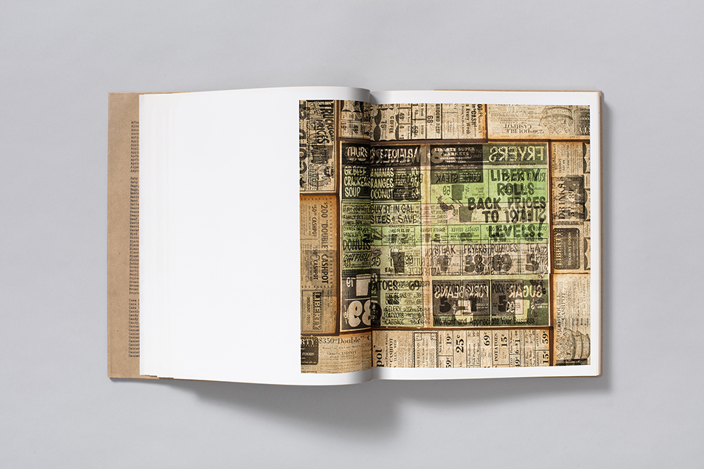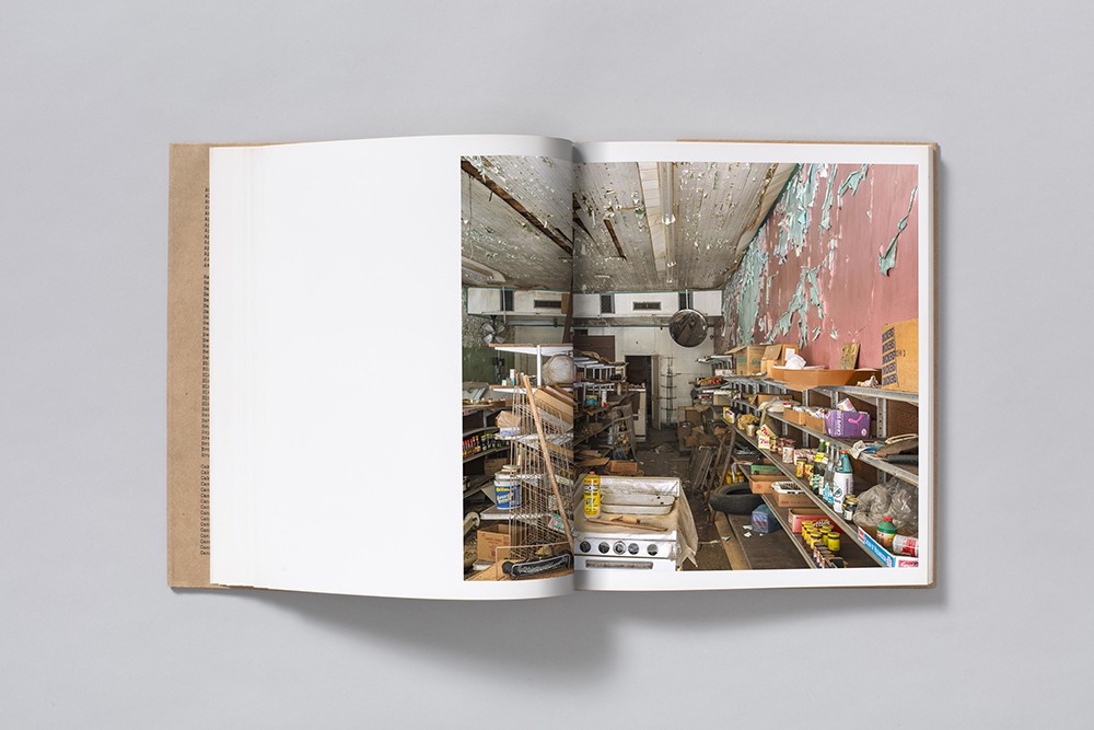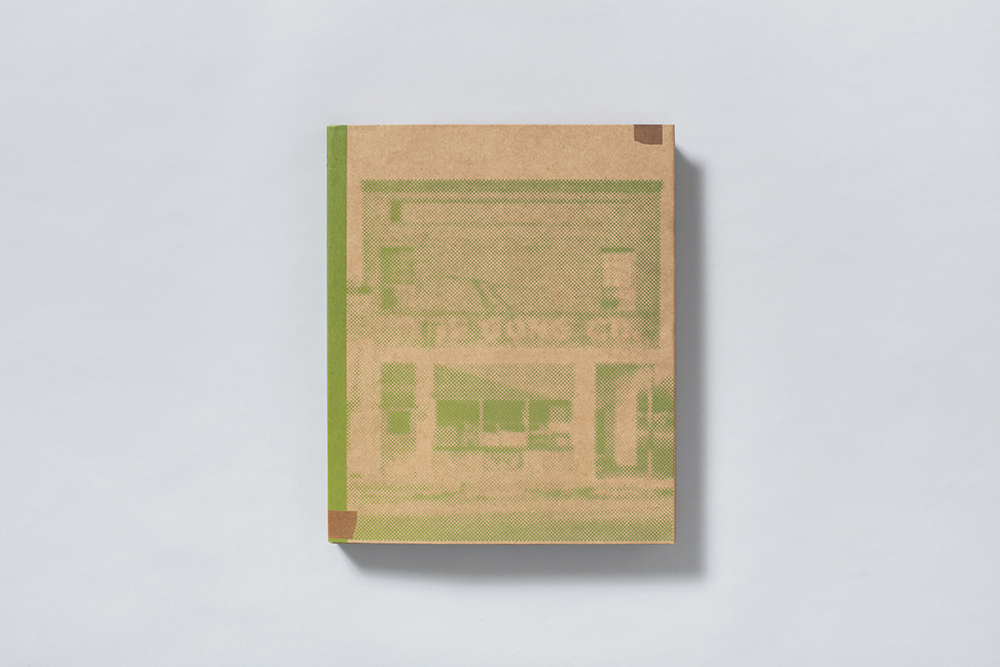 The exterior is most often the first part of the book that someone sees. The jacket front features a halftone-dot image of the facade of Gong Co. In a way the image is as much not-there as it is there at all. The Kraft paper takes on what I think a designer would call a “knockout” effect, becoming the background to the image of the store. In a way, the form/material and content/image fuse.