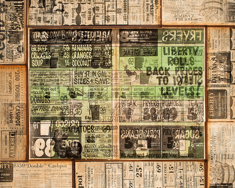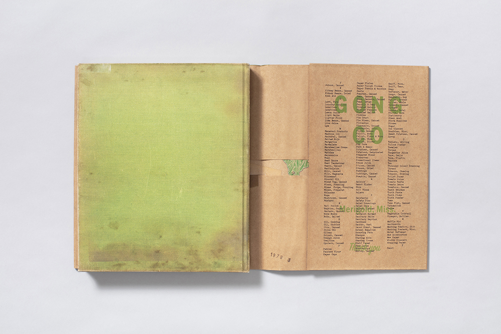 The first set of inner flaps, folded over the book’s boards, list an alphabetical inventory of the content of the store. The rear inner flap has green overset text: “GONG CO. Merigold, Miss.,” as it might have appeared on a grocery sack, and “Thank you,” which, given its placement, might be one of the last things someone viewing the book might read. The flaps provide the next set of information. It’s a grocery store, with that name, in that place.