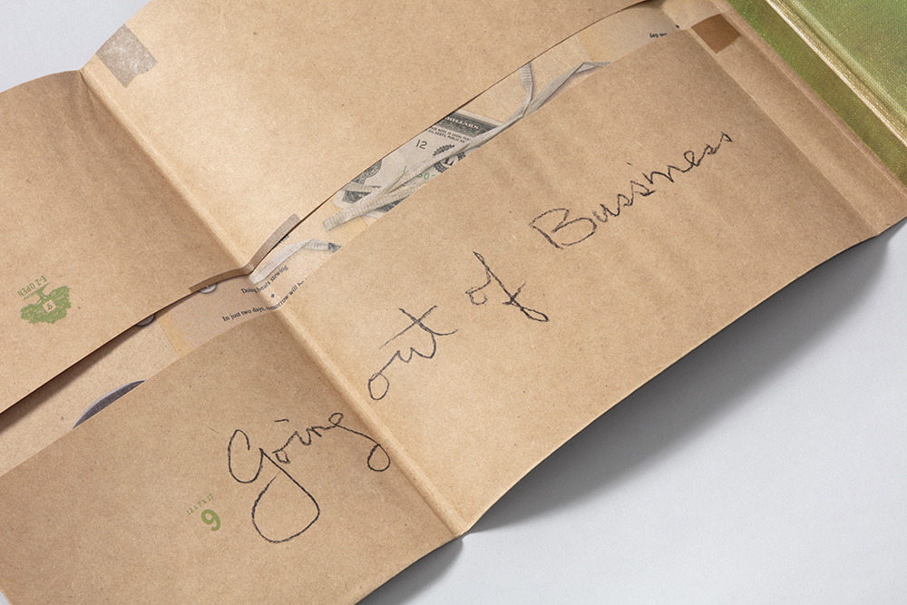 The second set of inner flaps include additional green ink elements as they might have appeared on a grocery sack. It’s a “#9” bag (I was born on the 9th day of the 9th month), and its “E-Z OPEN” logo features an oak tree very similar to the large oak tree pictured in the book, which stood in the center of Merigold. Some additional clues also appear — the handwritten message “Going out of Bussiness” (sic), a “1978” date stamp, and the word “PERISHABLE.”