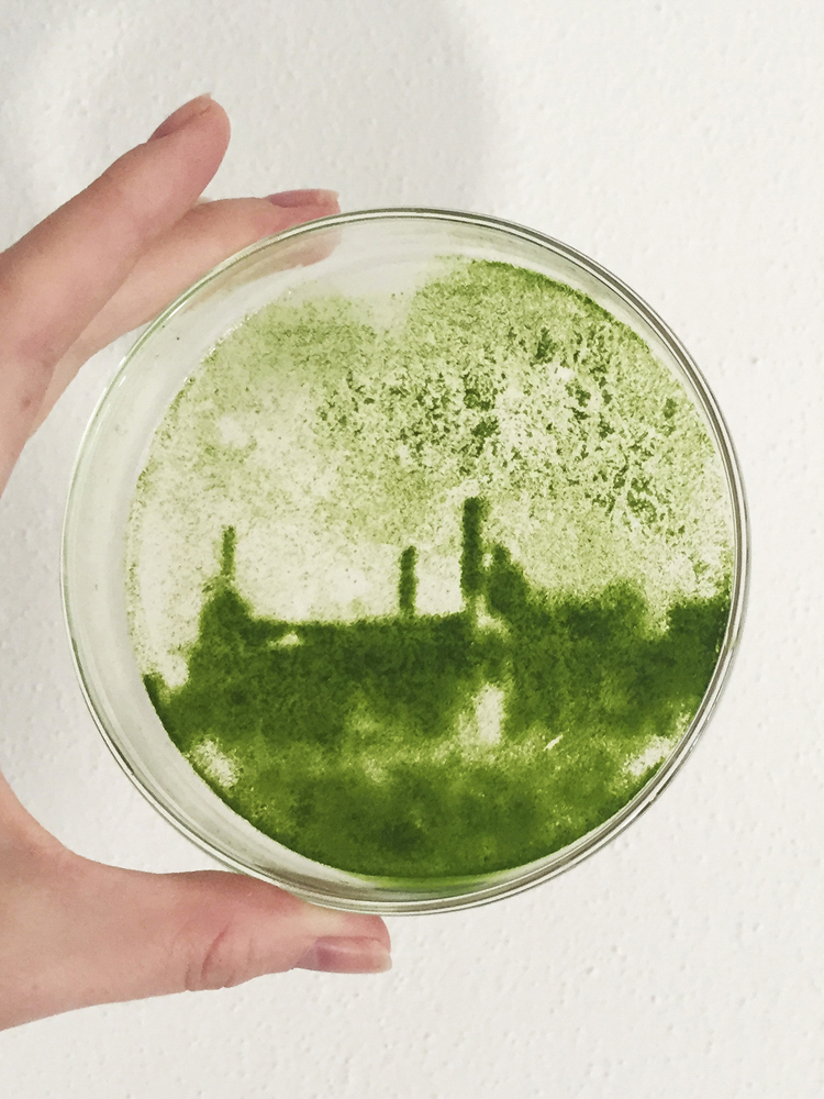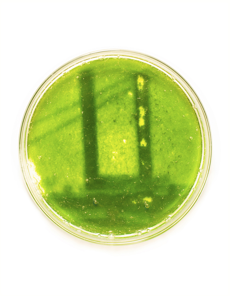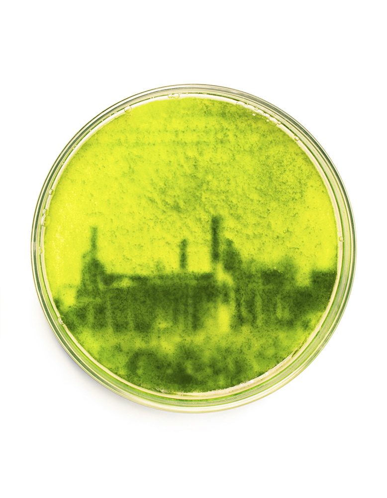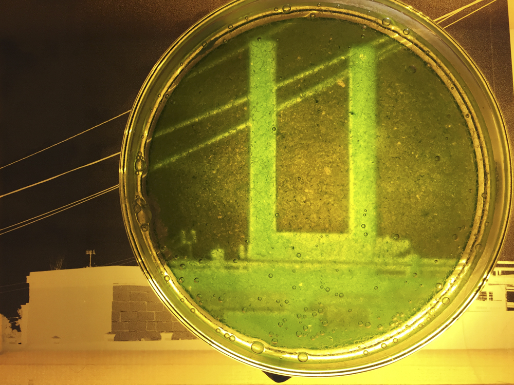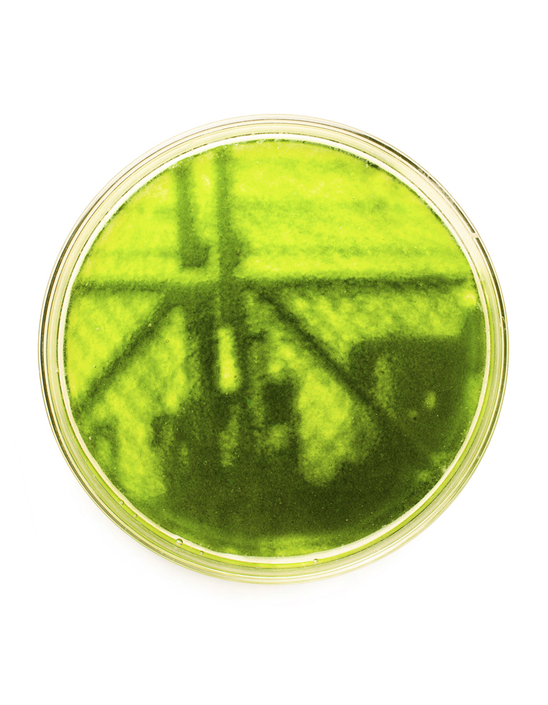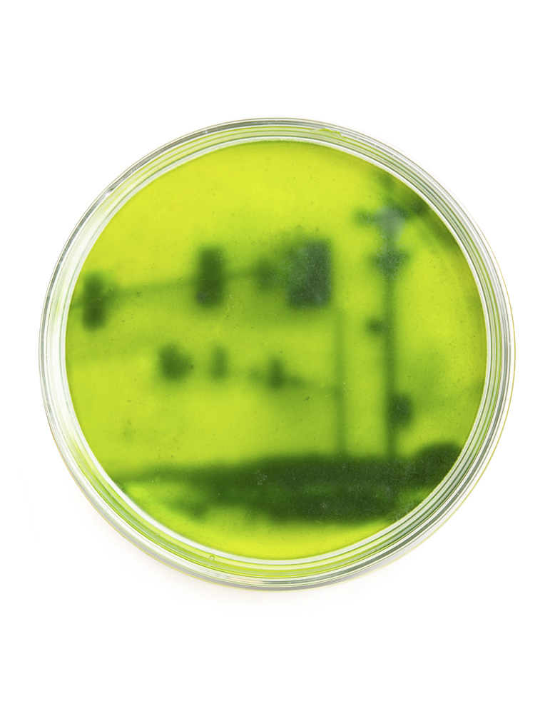 In her series Monett & Sedalia, Kari Varner investigates the impact of agriculture and food production on the land. After photographing the Tyson plant in the towns of Monett & Sedalia, she searched for a way to incorporate the landscape into the images. Using living microalgae, Chlorella vulgaris, she grows petri dishes of her Tyson plant photographs; the resulting images are ephemeral and specific to the land. They can take as long as a week to “develop” and require a level of attention reserved for the laboratory, not the darkroom. But by incorporating the process so deeply in the making of these works, Varner transforms the process into the subject matter.