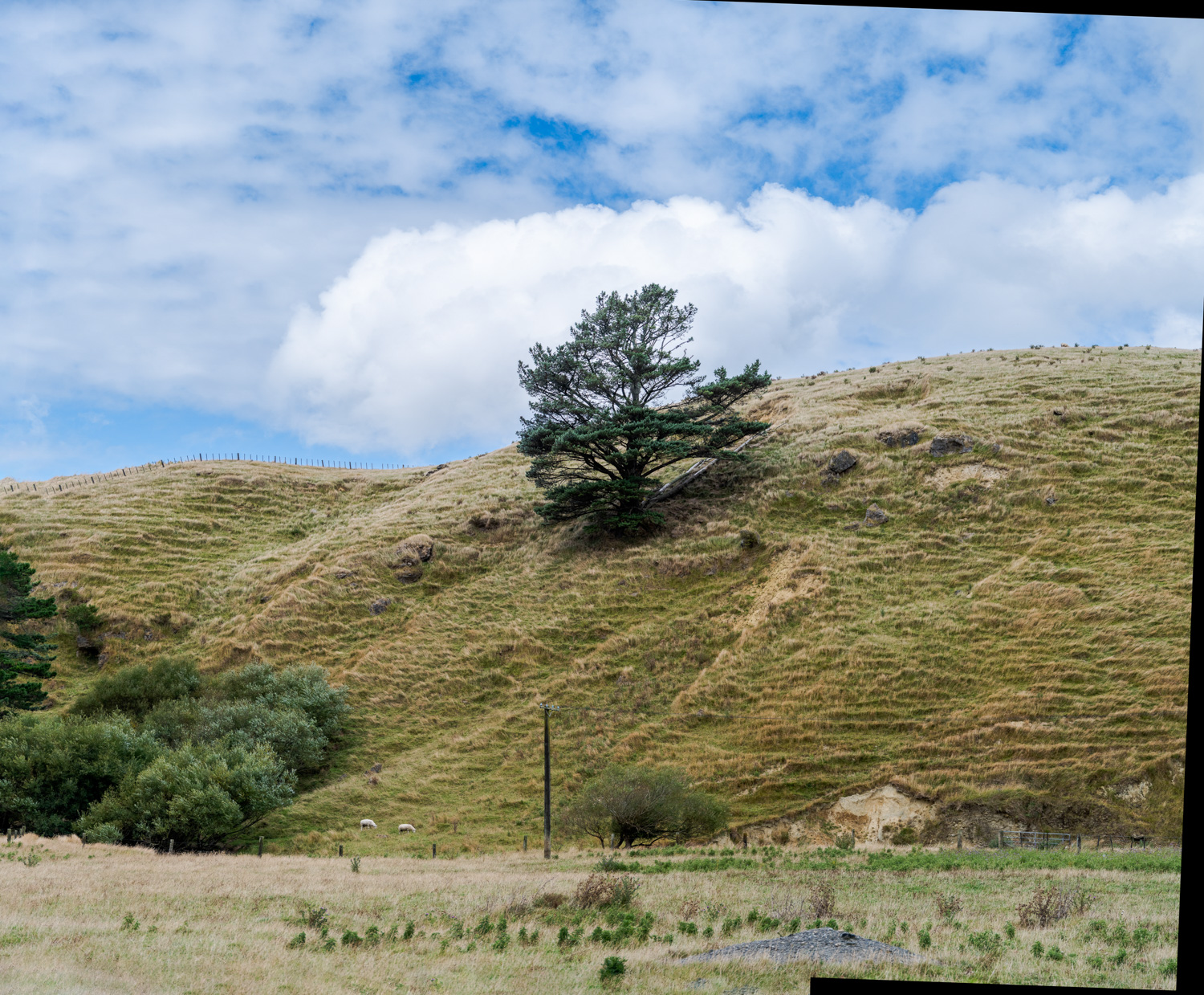 Pastureland, Te Ika-a-Māui North Island is a panorama, and the irregular border and rough edge visible in the bottom right act signify that the image is a composite. The image portrays the typical NZ scene of grazing sheep in a picturesque pasture. Scenes like this are so common there and romanticized (at least here in the States), that you could think that this is the native landscape. But of course it is a highly manipulated landscape. This hill was most likely native forest before being cleared for human uses.