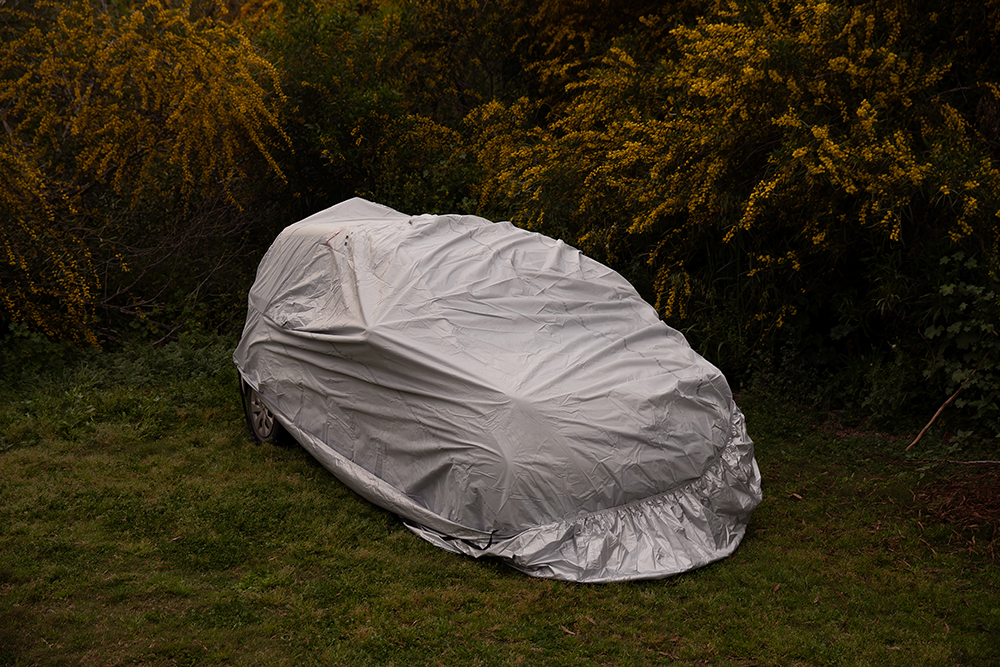 ©Oded Wagenstein, An organized setting of the covered car of Moshe Etzion, who took his own life at the age of 88. March 2023, Kfar Monash, Israel. The photographer covered the car to symbolize Jewish shrouds, the traditional burial cloth in which a body is wrapped before burial.