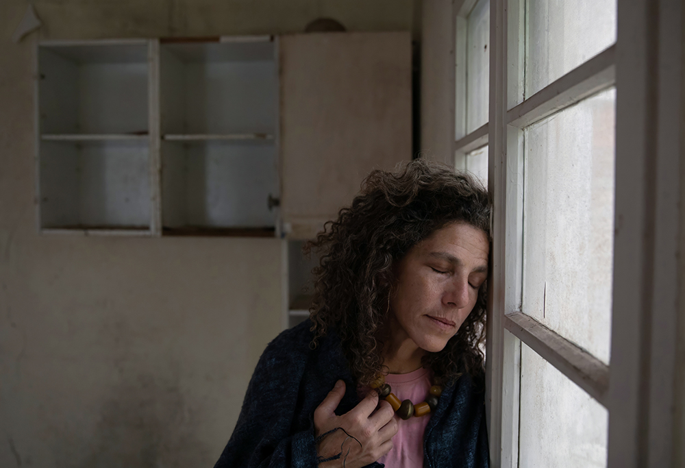 ©Oded Wagenstein, Yael Ben Ari stands for a portrait in her family’s abandoned estate, a place once filled with joy and cherished memories but also marked by the unraveling of her family. Here, her mother, Zipora Ben Ari, took her own life at the age of 63. In this photograph, Yael is wearing her mother’s necklace and scarf. May 2023, Kfar Neter, Israel. Zipporah was once known for her vibrant and active personality. However, her mental health began to deteriorate following the tragic death of her nephew in a military service accident. Yael, her daughter, reflects on the silence surrounding their family’s suffering: “No one dares to ask, and I really wish they would. I want to tell the truth, to talk about the fear.”