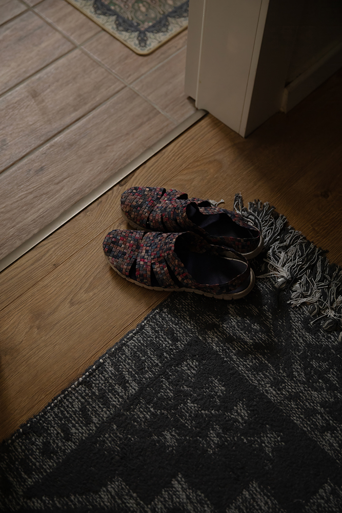 ©Oded Wagenstein, Sara (Sari) Paz’s shoes placed in an organized setting on her sofa. Sara took her own life at the age of 59 in the bathtub. December 2023, Pardes Hanna, Israel.