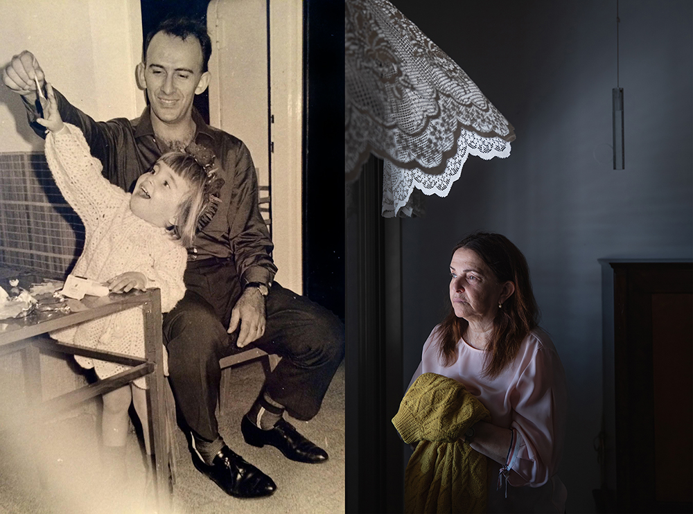 ©Oded Wagenstein, (L) Shmuel Hazon with his daughter Michal. Unknown photographer. (R) Michal Shmueli Hazon stands for a portrait in front of the window where her 86-year-old father, Shmuel Hazon, exited and jumped to his death. Petah Tikva, Israel. Shmuel, bereaved by the loss of his son in a terror attack, found solace in entrepreneurship and volunteering, especially with parents who suffered a similar loss. However, the isolation brought on by COVID-19 quarantines deeply affected him, eroding his sense of purpose and connection to society. Struggling with profound grief, Shmuel took his own life