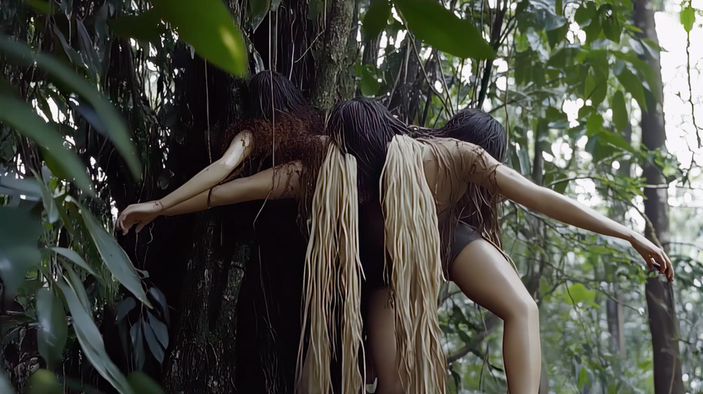 Sayler: That piece, The Prophecy of Butterflies, while we wanted to work with AI in making that particular piece, we did not. It’s CGI. We were already kind of thinking along the lines of it takes a hyper object to know a hyper object: how would AI behave in this space? We did a considerable amount of field work in the Amazon, and were influenced by a book by Eduardo Viveros de Castro on Indigenous worldviews that have a much broader understanding of nonhuman communication.