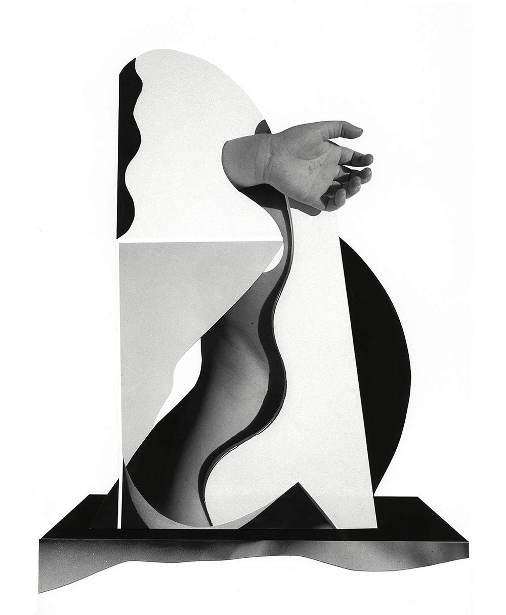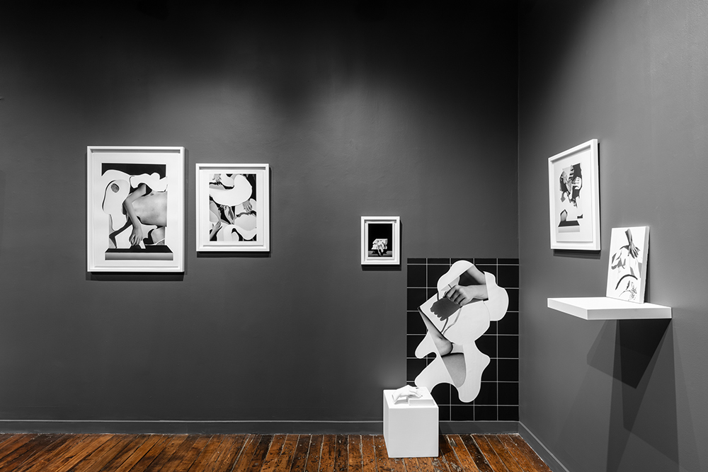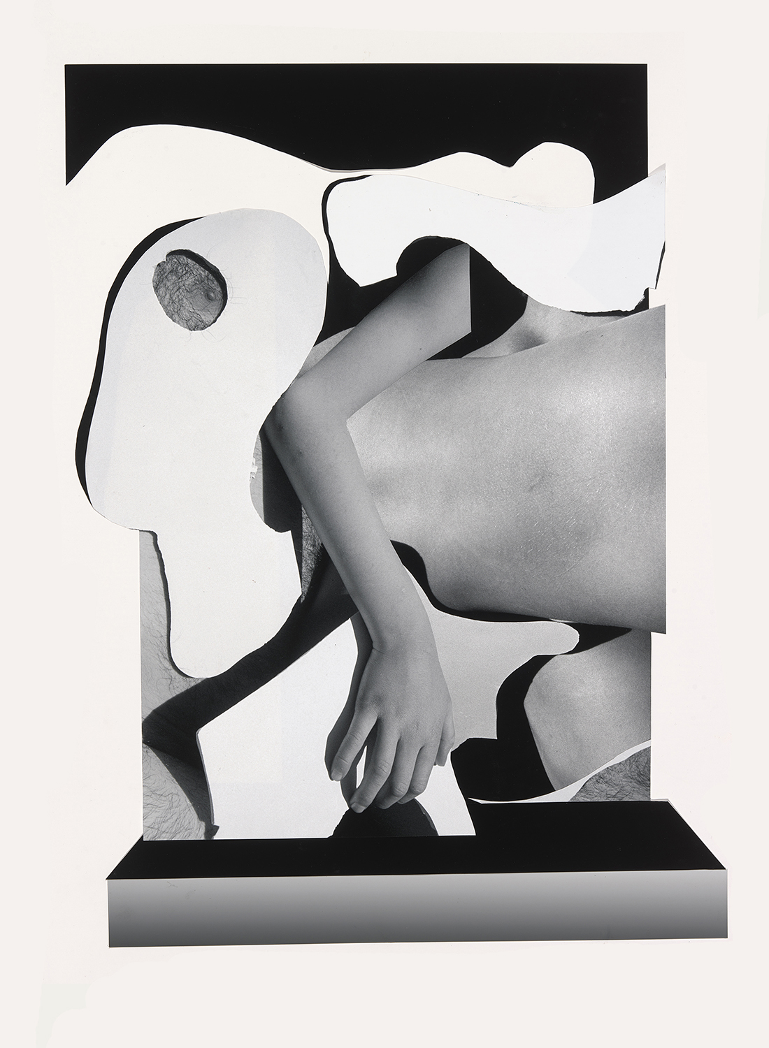 In disorienting reconstructions, Woods uses a vocabulary of bodily forms that repeat in variations, reflecting the repetitive and often confining aspects of nurturing. But it is in these tight spaces where Woods’ work opens to possibility. In surreal juxtapositions, limbs float, bodies merge, time and space dissolve. Plaster casts of her children’s hands record time tenderly and also look like stark fragments from classical antiquity. Organic shapes obliterate but can be openings. There is an austerity in the black and white presentation that abstracts rather than sentimentalizes. The installation, curated by Allie Haeusslein, extends the work into sculptural assemblages where pedestals and objects cast shadows and layered imagery spills into space.